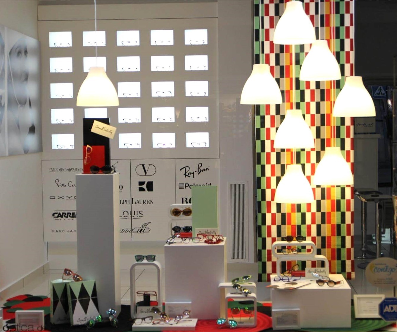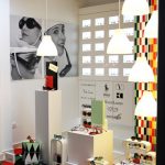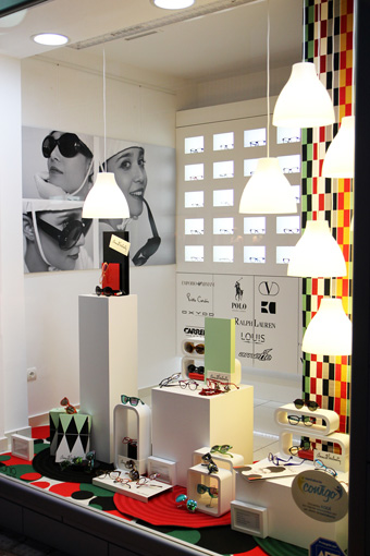 Utilizando una tricromía básica y figuras geométricas planteamos este escaparate con un suelo tapizado en círculos. En línea con una estética corporativa para esta firma presentamos la prestigiosa marca «Anne & Valentin».