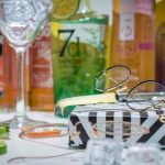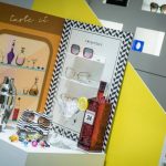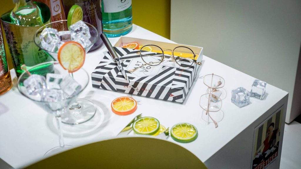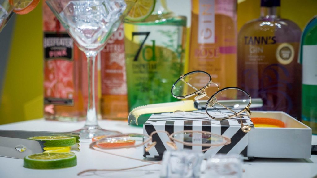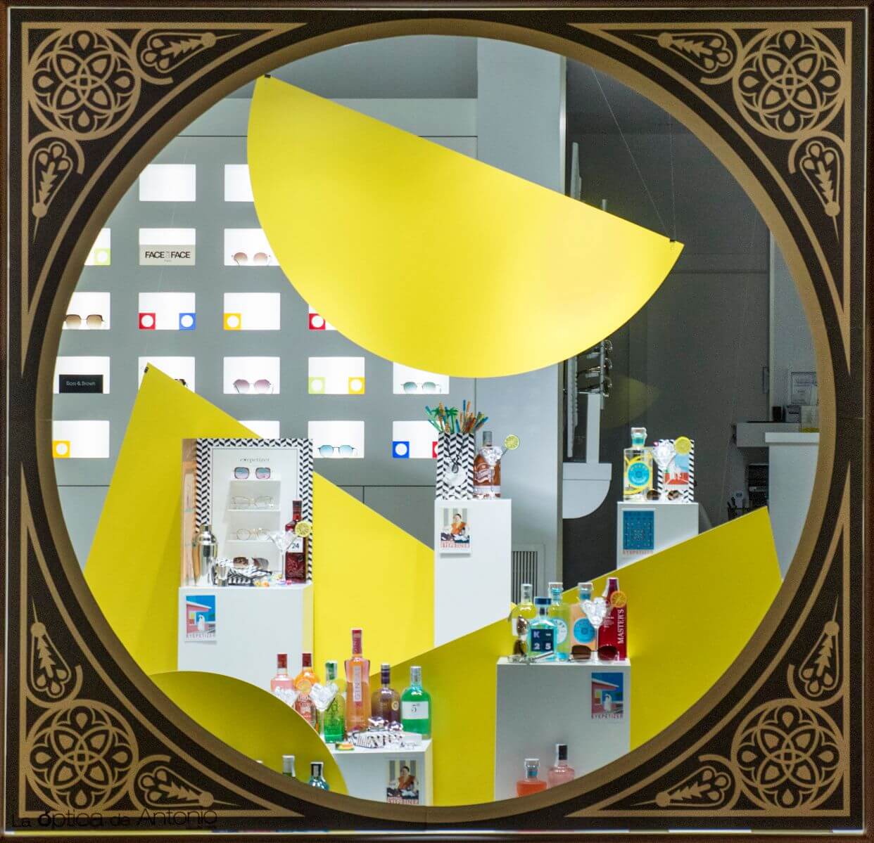 El escaparate lo hemos planteado sobre una base vinílica en damero blanco y negro. El vinilo frontal proporciona una forma circular, en “ojo de buey”, que invita a asomarse al espectador/a. Los diferentes paneles de PVC amarillos, proporcionan un juego de profundidades, donde colocamos una gran variedad de botellas de Ginebra.