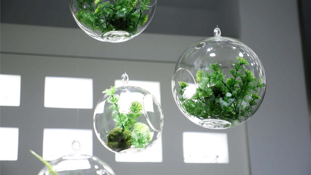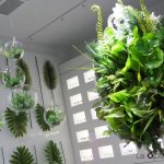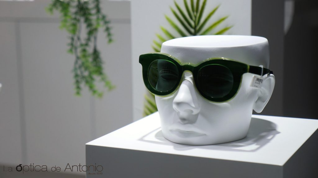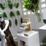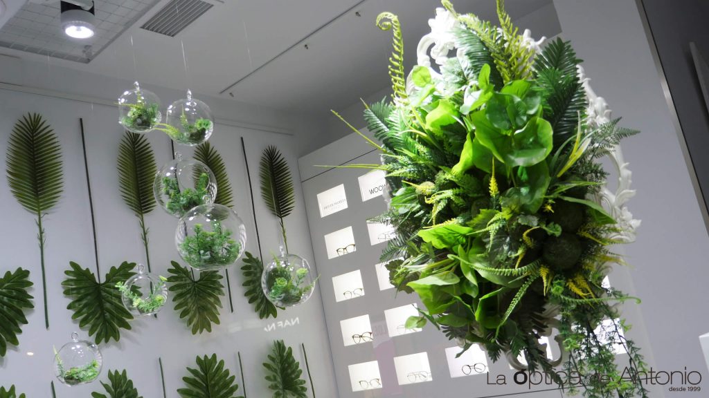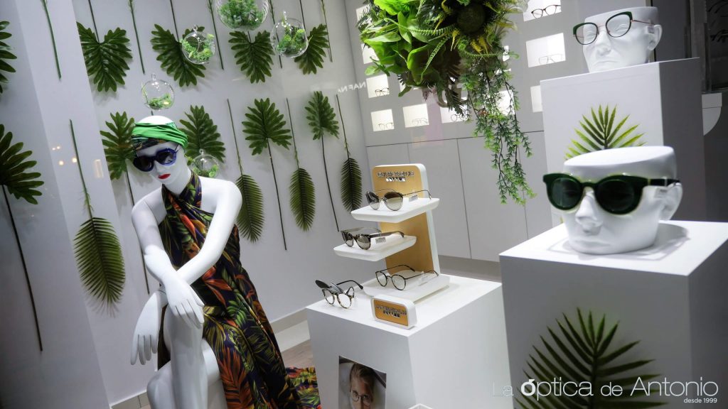 Se trata de un escaparate basado en formas vegetales, buscan aportar frescura y colorido. La disposición de hojas tropicales y palmas en la pared, consigue el efecto visual de un papel decorativo, que conecta con el estampado del vestido de la maniquí. Las burbujas de cristal aportan pequeños toques botánicos en un intento de introducir aire y movimiento a la escena. Presentado en dos versiones, el cambio de vestido, complementos y gafas hacen que la imagen sea del todo diferente.