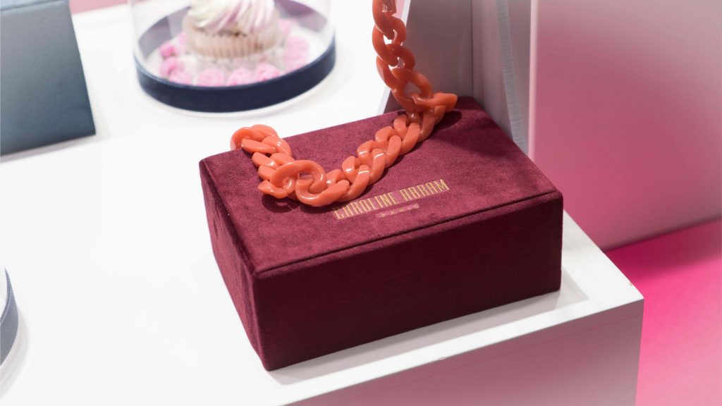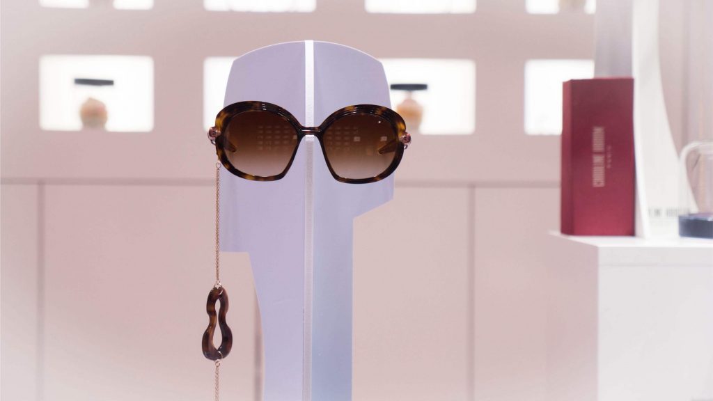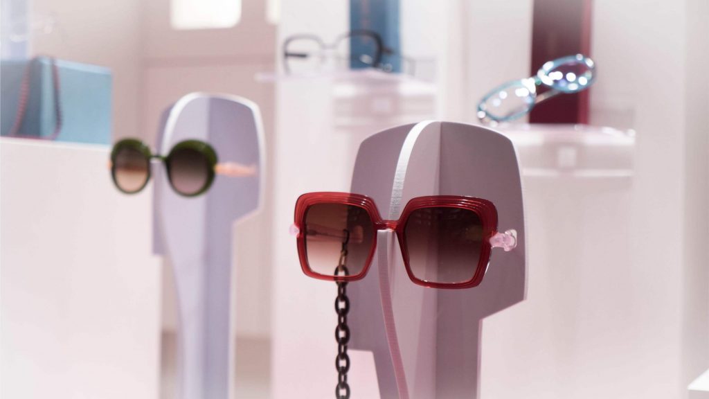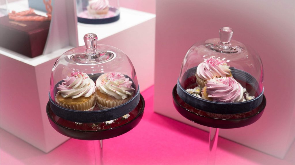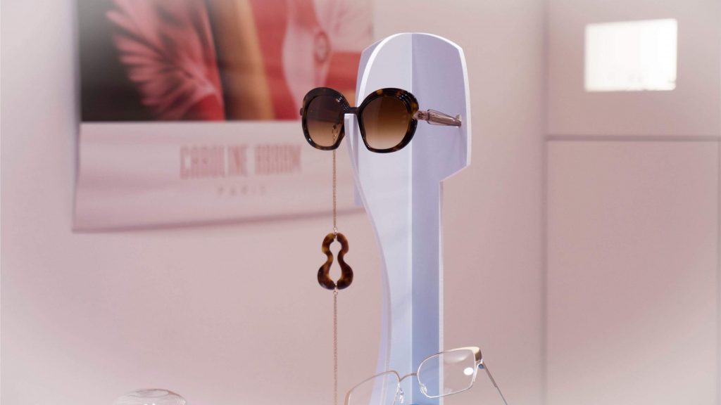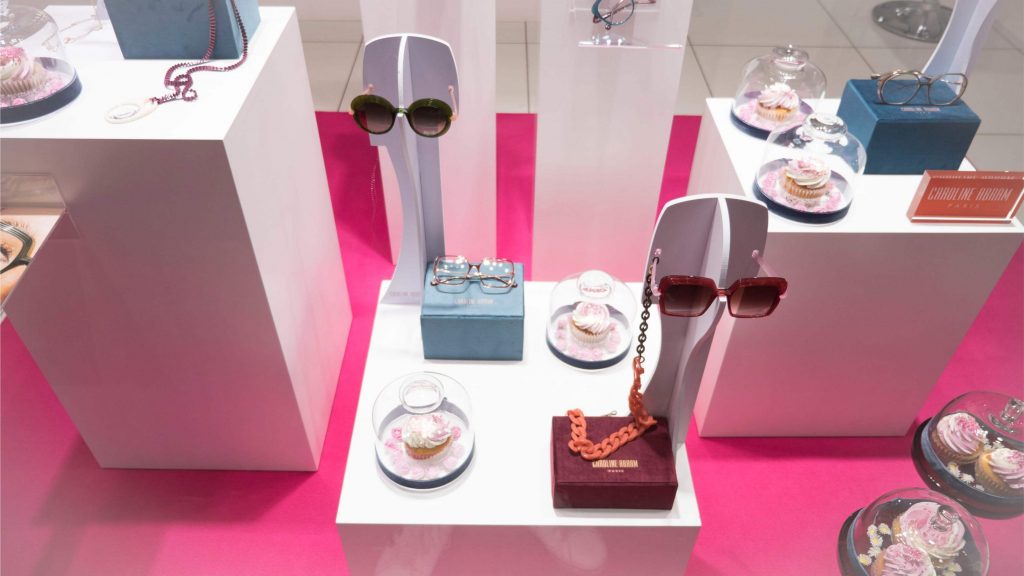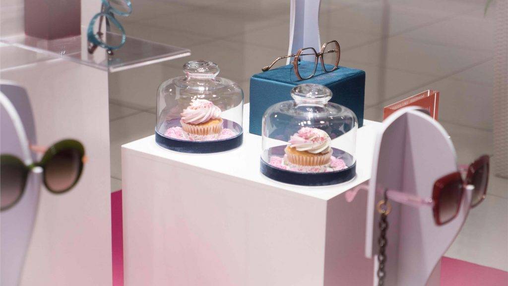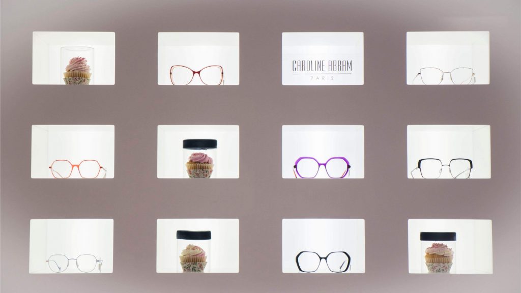 Nuestro escaparate de Pascua tiene un intenso olor a fresa y nata. Una tentación para golosos/as, ya que está repleto de cupcakes. Un dulce que en los últimos años está de moda, y  que ya aparecía en el manual de cocina de Amelia Simmons a finales del XVIII: “American Cookery”. Un marco ideal para presentaros la nueva colección de Caroline Abram, gafas con volúmenes, color y un toque art decó que las hacen realmente elegantes y singulares. Los tonos pastel de los dulces contrastan con la moqueta fucsia y el terciopelo azul de vitrinas y expositores. Un escaparate abierto de composición descendente, que deja ver un fondo de celdas con gafas y cupcakes.
