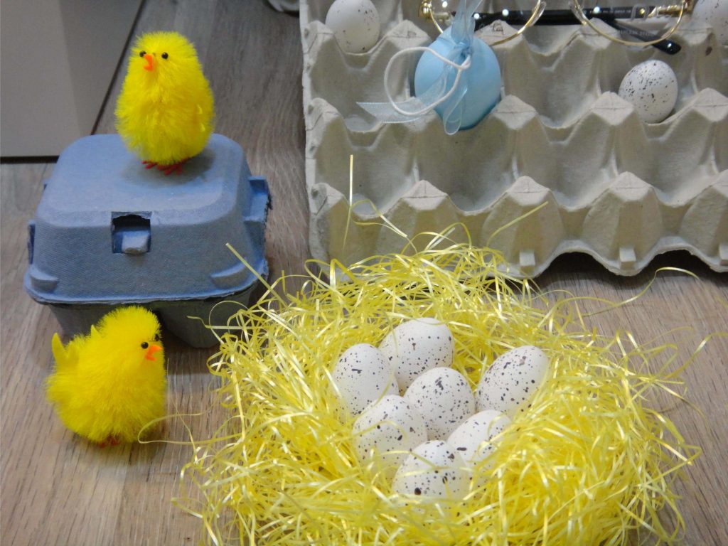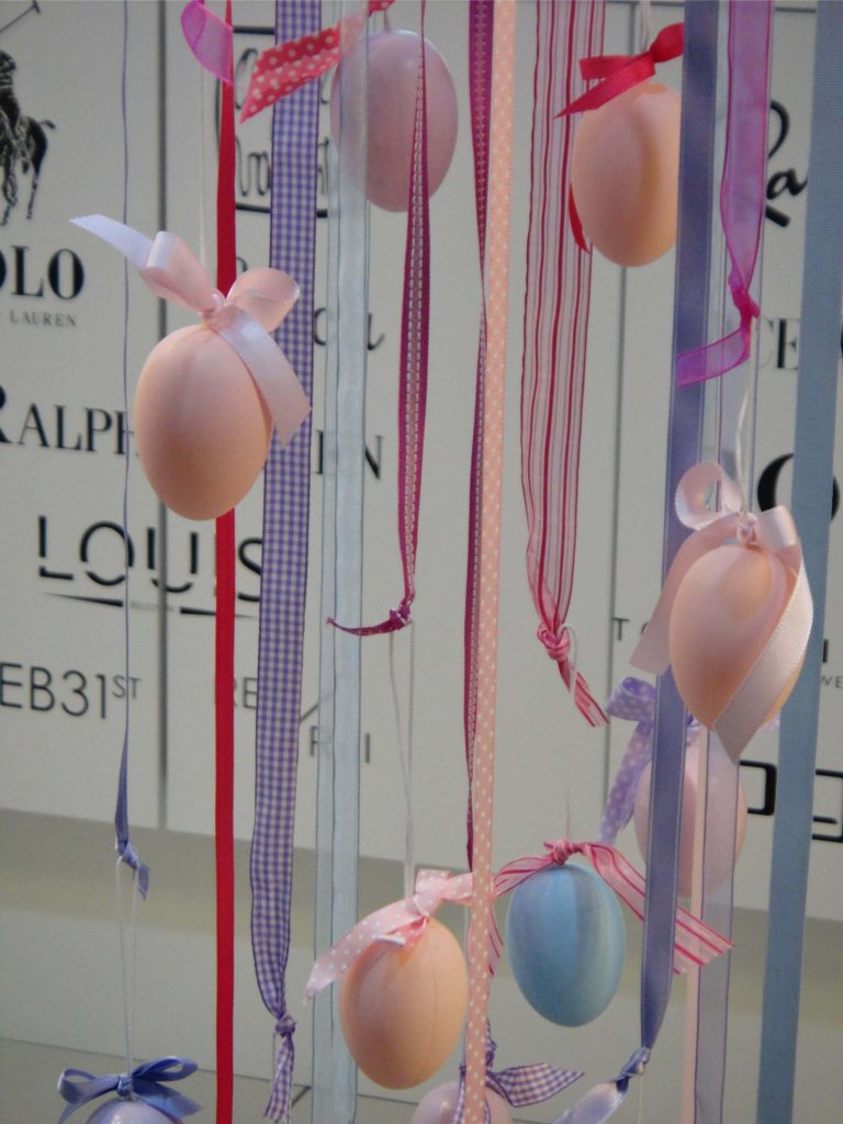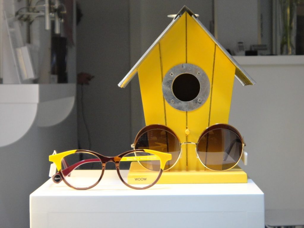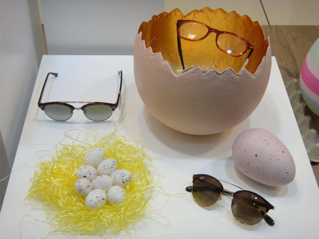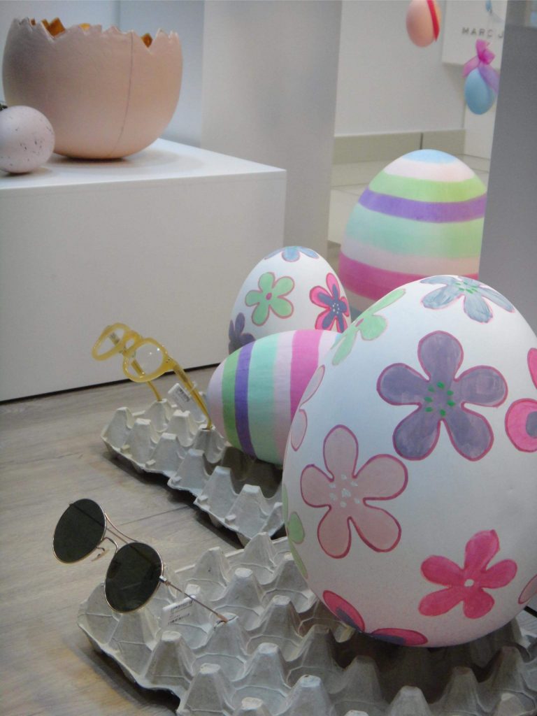 En esta ocasión nuestro escaparate se encuentra repleto de huevos de pascua, se trata de un canto a la vida, a la fertilidad y un divertido montaje que está resultando muy llamativo para niños y mayores. Sobre una base blanca y combinando los tonos pastel de cintas y huevos, hemos elaborado una gran corona de pascua que establece el punto de atención principal. Con relativa simetría, se sitúan varios focos de color amarillo yema como nidos y casitas nido. En la parte inferior utilizamos embalaje propio de huevos para configurar el suelo. Coincidiendo con las formas ovoides hemos seleccionado modelos de gafas de sol y de graduado redondas o redondeadas, ya que hoy por hoy, lo circular está más de moda que nunca.