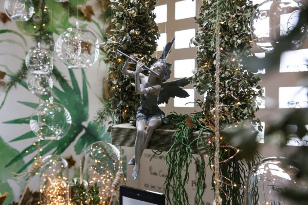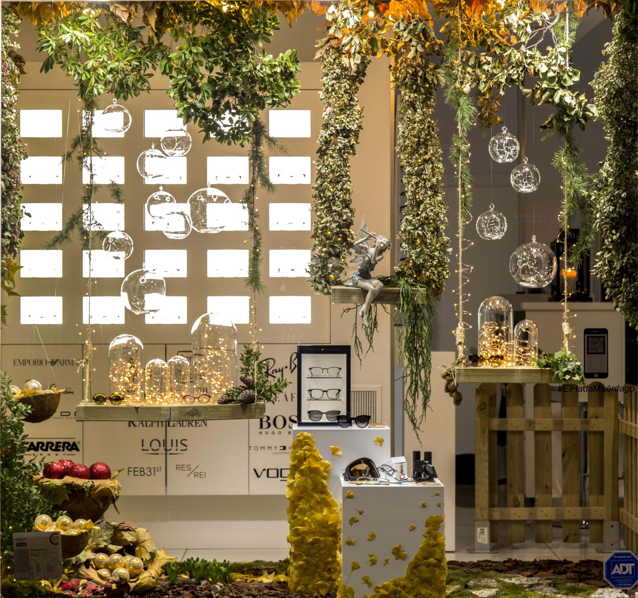 Se trata de una composición vertical que divide el escaparate en tres zonas, claramente diferenciadas. Estas divisiones están marcadas por tres columpios de madera suspendidos del techo. La escena principal ocupa la zona central del escaparate. En ella, el Hada está sentada en un columpio suspendido del techo por lianas de encina. El Hada convoca con la música de su flauta al resto de hadas del bosque, representadas como luciérnagas por cientos de ledes, cuyo ritmo de encendido y apagado es muy similar al fenómeno de fosforescencia de este peculiar insecto. Bajo el columpio, se sitúan dos módulos con gafas de sol y graduado, además de otros instrumentos ópticos. Los módulos están integrados en la escena con unas llamativas hojas amarillas de ginkgo biloba, un árbol prehistórico y único en su especie. La superposición de unas y otras consigue un efecto similar al de un nido de mariposas.