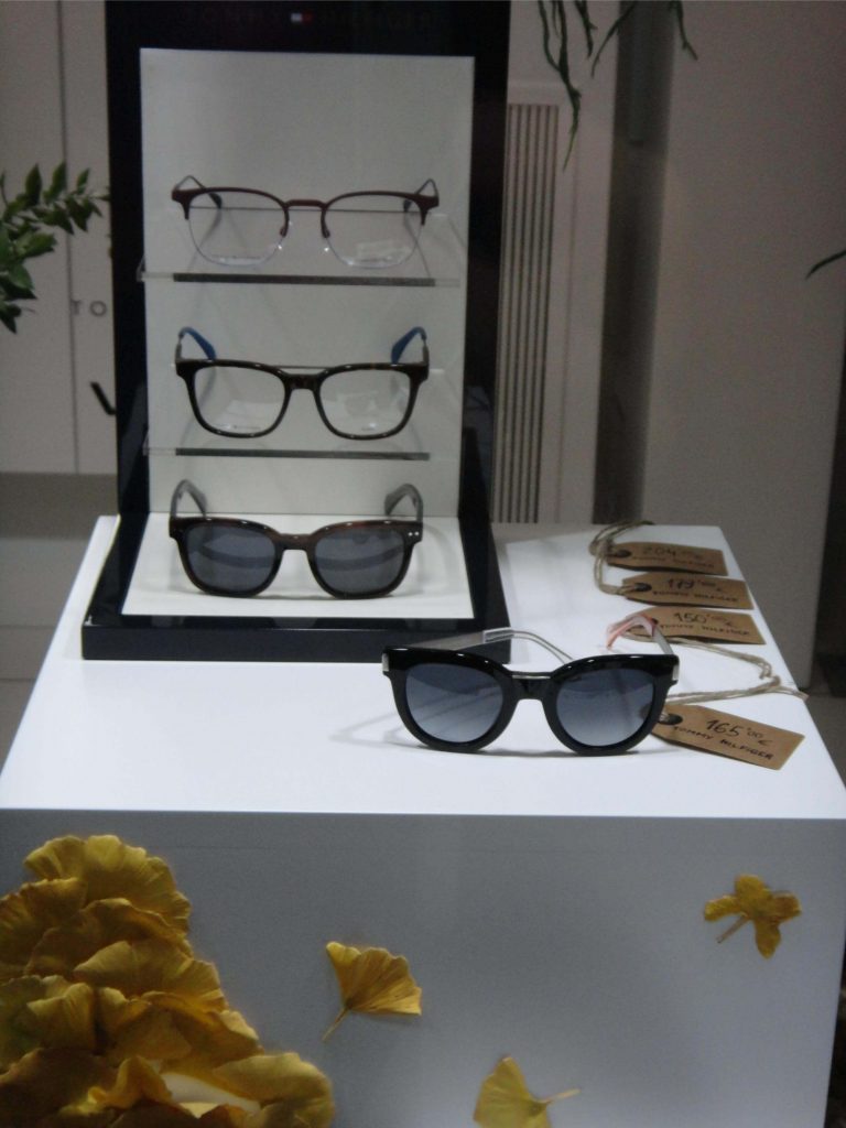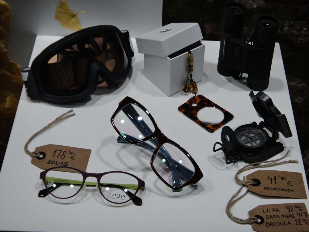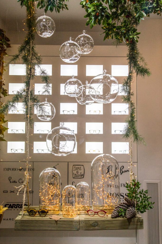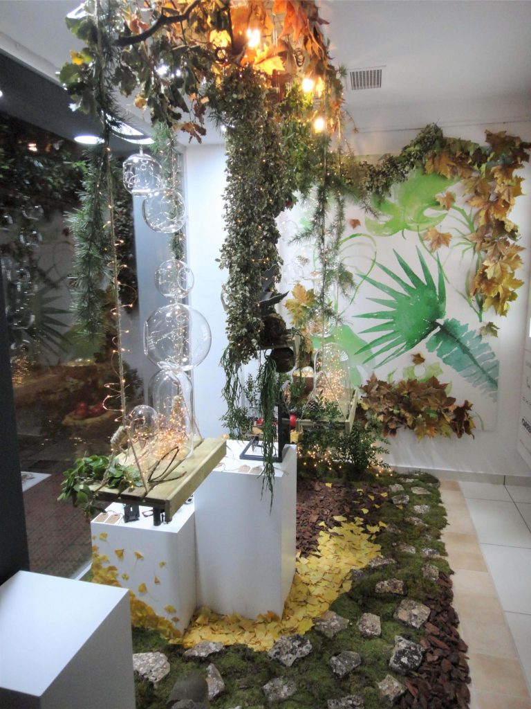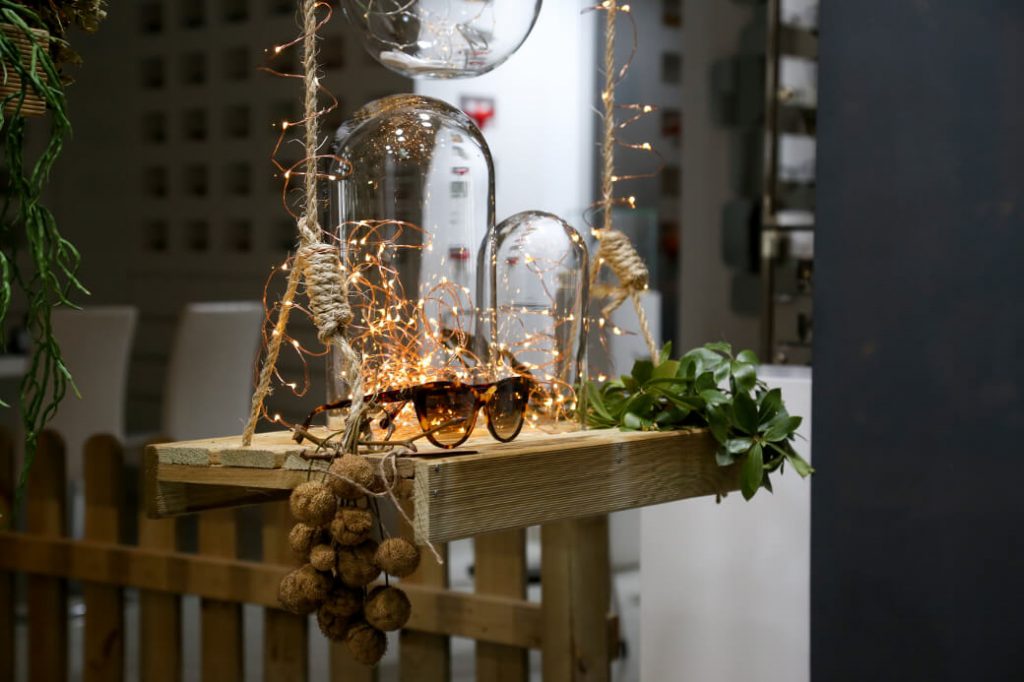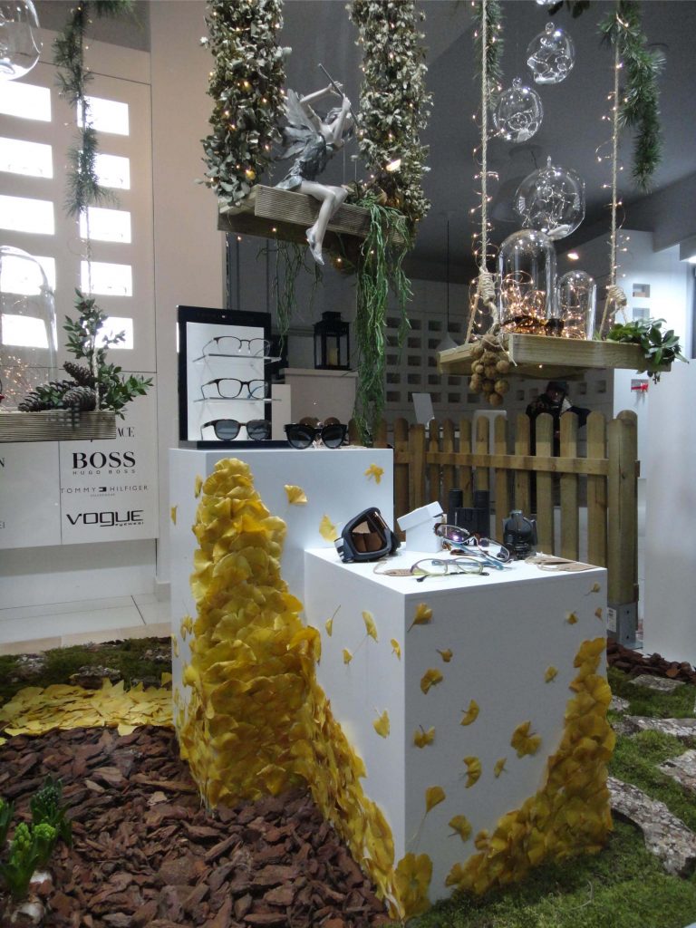 El suelo de este bosque mágico está confeccionado con mantas de césped natural, corteza de pino, piedras y hojas. Las diferentes texturas y colores, nos han permitido diseñar un sendero que introduce al espectador desde el margen derecho al interior del escaparate, donde está la implantación de gafas en celdas retroiluminadas y una acuarela gigante de motivos vegetales. De esta manera, el escaparate es visible también desde el interior de la tienda y el cliente pueda disfrutar de otras perspectivas.