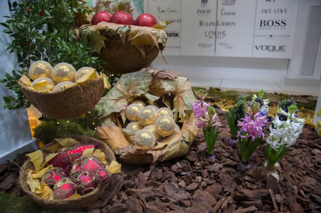 En el suelo del lateral izquierdo, existe una escalada de detalles. Desde el parterre de bulbos hasta los diferentes niveles de unos cestos con muchos de los adornos navideños, que las hadas guardan celosamente año tras año. Los cestos están confeccionados en fibra de coco y hojas de platanero. Los bulbos de Jacinto son auténticos, por lo que resulta muy llamativo para el viandante observar, día tras día, el crecimiento y la floración de los mismos.