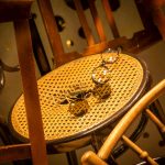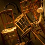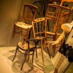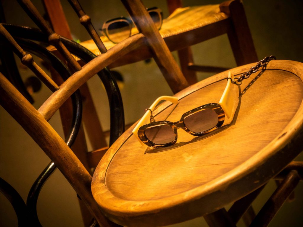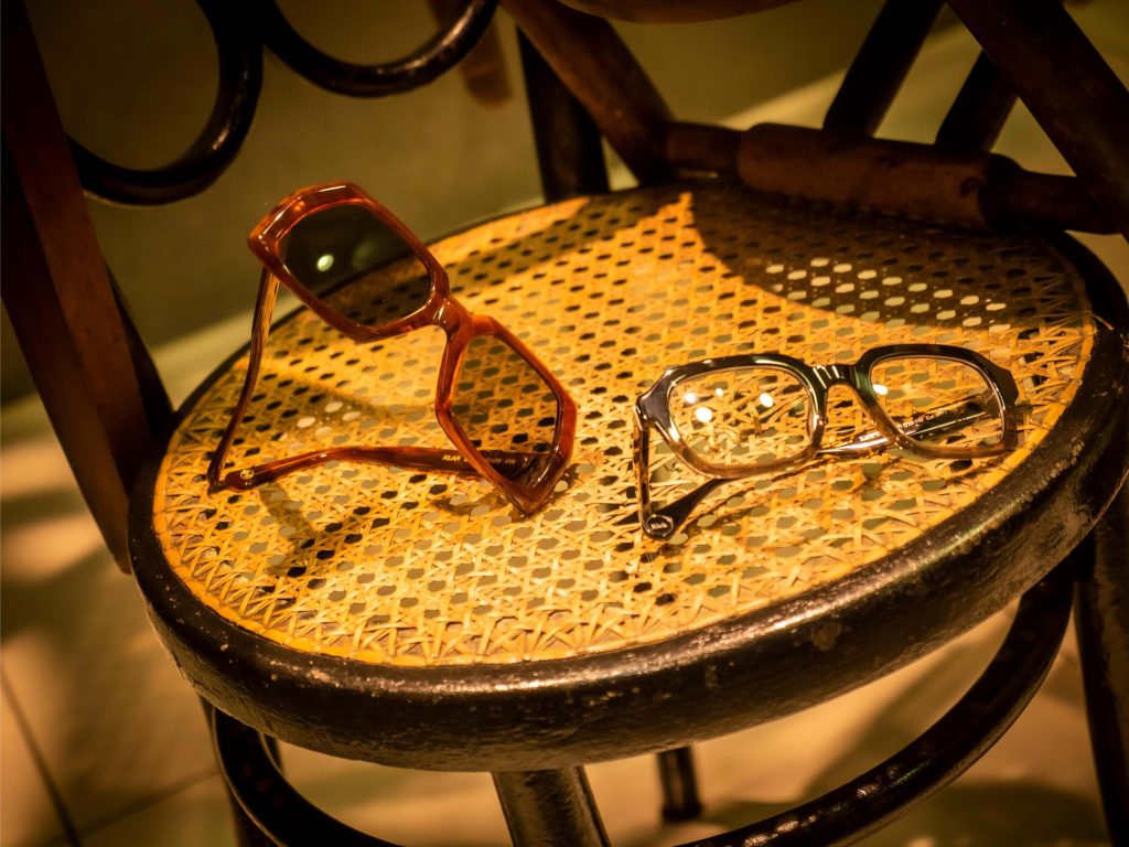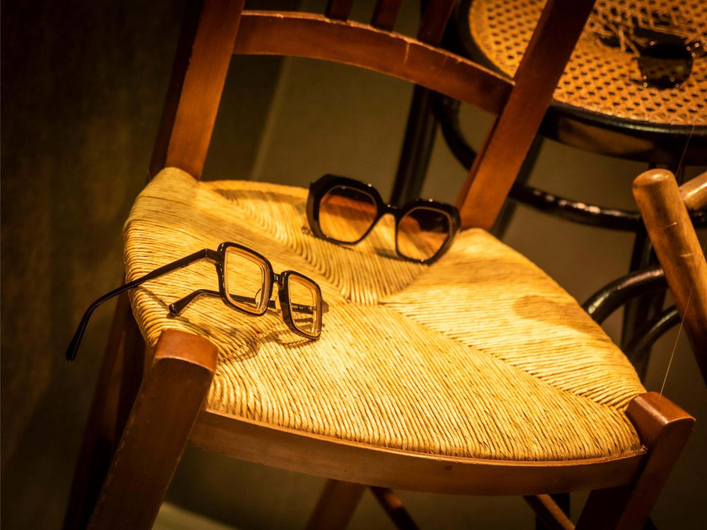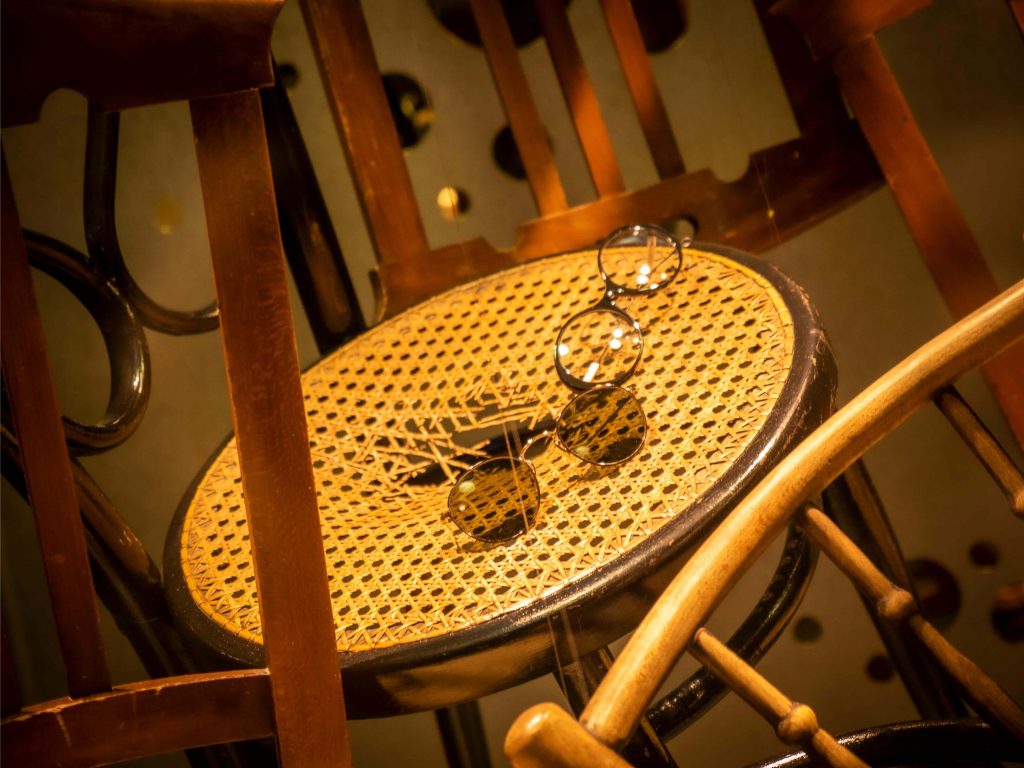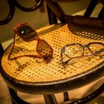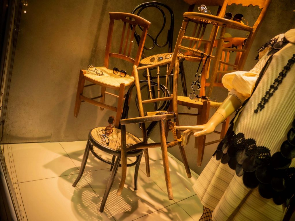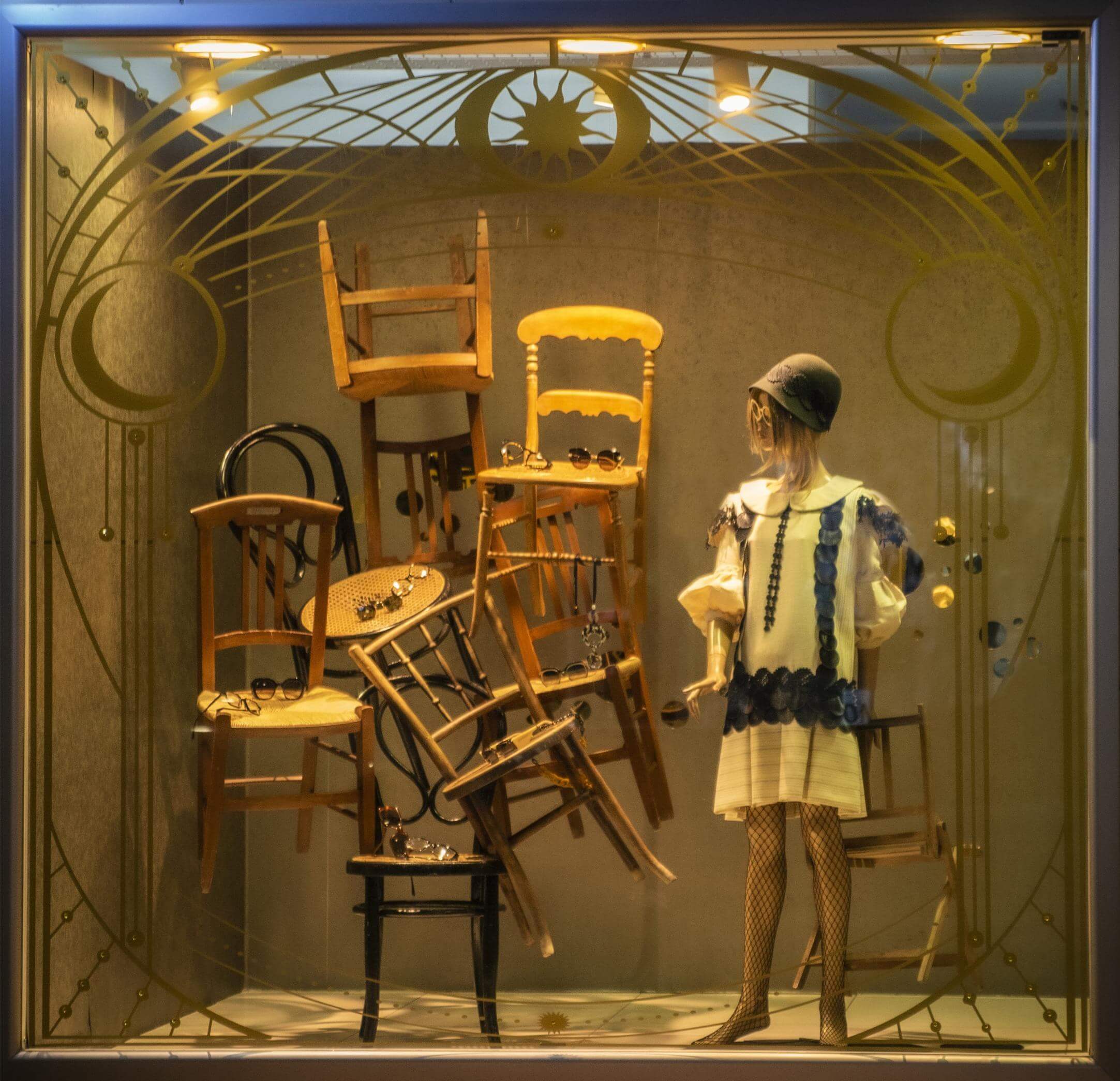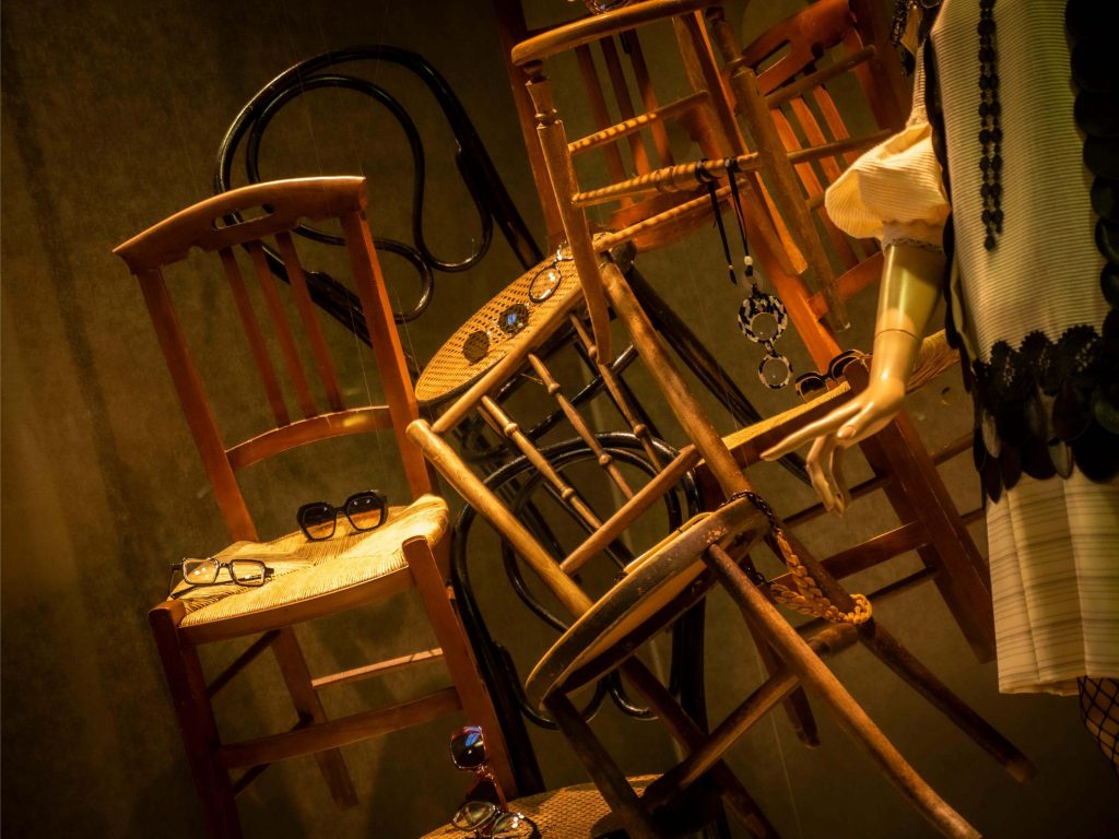 Al igual que las recetas de aprovechamiento, tan en auge hoy en día, hemos querido darle un segundo uso al vinilo Art Dèco de nuestro escaparate de Navidad y a la estructura que lo delimita. Nos situamos a comienzos del s.XX, la época del charlestón y los cafés. Nuestro expositor, esta vez, es una torre de sillas centenarias de diferentes estilos. Hemos empleado las consignas de un escaparate minimalista en un montaje vertical y cerrado. Jugando con la iluminación: la situación de los focos y su temperatura (luz cálida). Los colores que predominan son negro, beige, avellana y materiales naturales como la madera. En un resurgir de la moda de esta época, creemos que se produce un interesante contraste entre las antigüedades y las últimas propuestas en gafas.