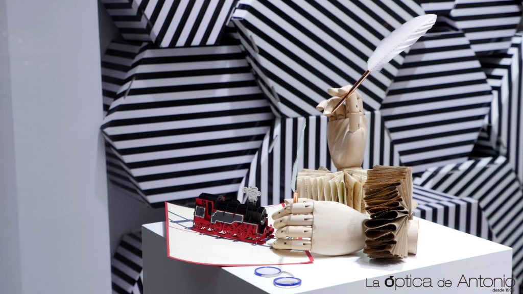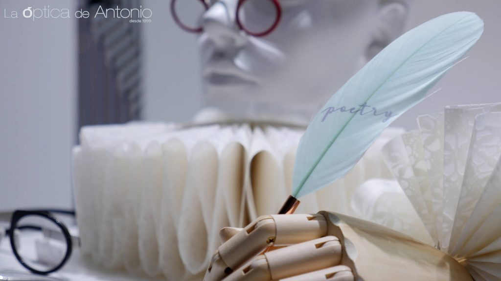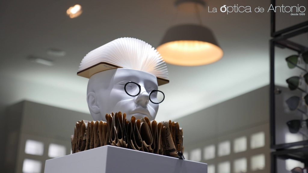 Con motivo de las V Jornadas de Vino y Bautismo Cervantino, La óptica de Antonio ha querido homenajear la figura del genial escritor, D. Miguel de Cervantes, con la puesta de un escaparate especial. Para ello, nos hemos basado en técnicas de papiroflexia además de utilizar elementos naturales como la madera o las plumas. Resulta un planteamiento minimalista, en le que hemos utilizado, metafóricamente, lámparas libros y una reinvención de los clásicos anteojos tan populares en el Siglo de Oro español.