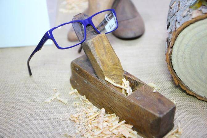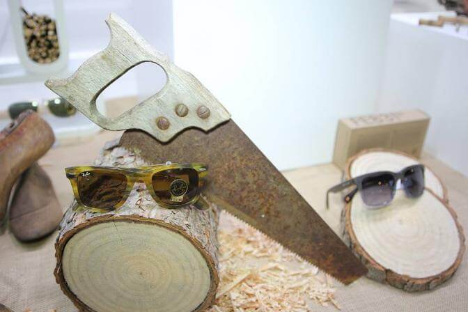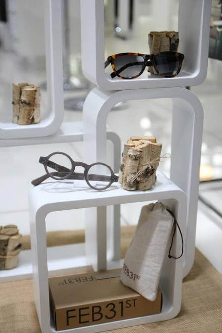 Este escaparate intenta recrear una antigua carpintería en la que entre virutas y herramientas antiguas, trabaja un artesano en el cuidadoso proceso de fabricación de unas gafas muy especiales. Sobre planchas de madera de pino se exhiben estas artesanas gafas de madera, modelos únicos y numerados de un artículo exclusivo y muy refinado.