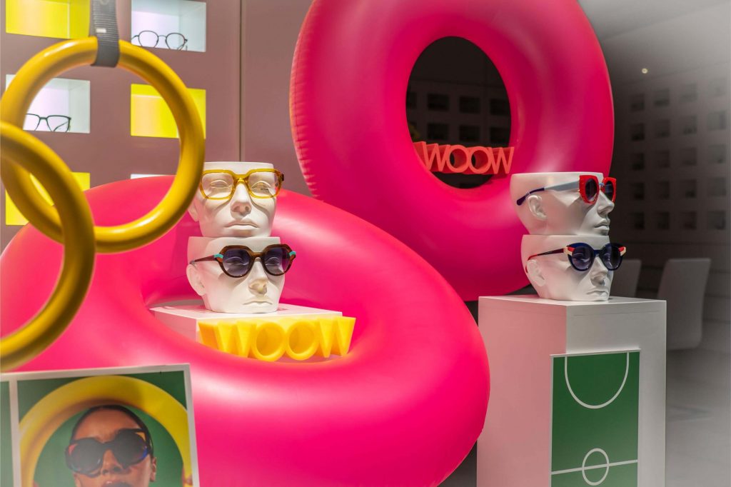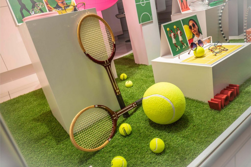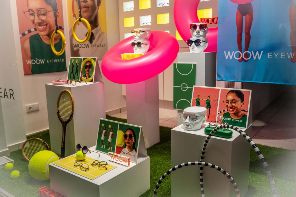 Inspirados en Paris 2024, los diseñadores de la marca francesa WOOW EYEWEAR nos introducen en el mundo del deporte. Colorista, alegre y festiva, la colección resulta ideal para el verano. Las fotografías que aparecen en los displays y banderolas son muy divertidas y realmente acertadas. En ellas podemos ver a unos modelos con un look retro en diferentes modalidades deportivas. Lo complicado de este escaparate ha sido conseguir unos materiales lo más parecidos a los de la publicidad: raquetas de madera ochenteras, aros bicolor, flotador gigante fucsia, pelota de tenis jumbo o anillas de halterofilia amarillas. Una tarea en la que hemos puesto en marcha nuestro ingenio y habilidades. Sobre un campo de hierba artificial y con nuestros habituales módulos blancos, hemos recreado las diferentes escenas. ¿Qué te parece?