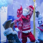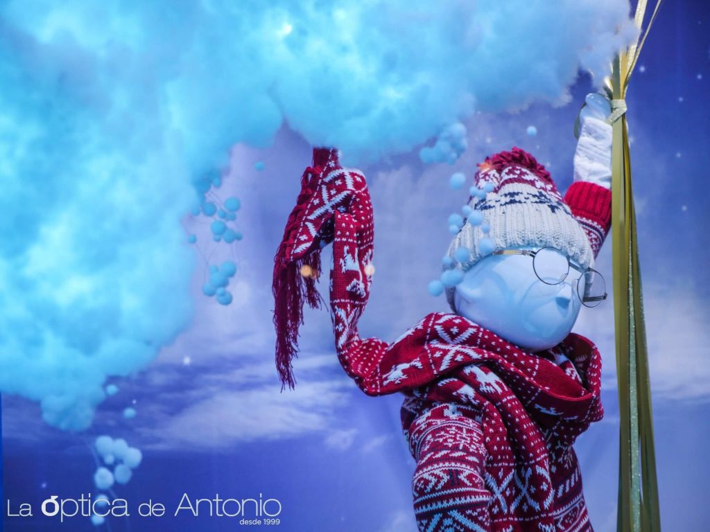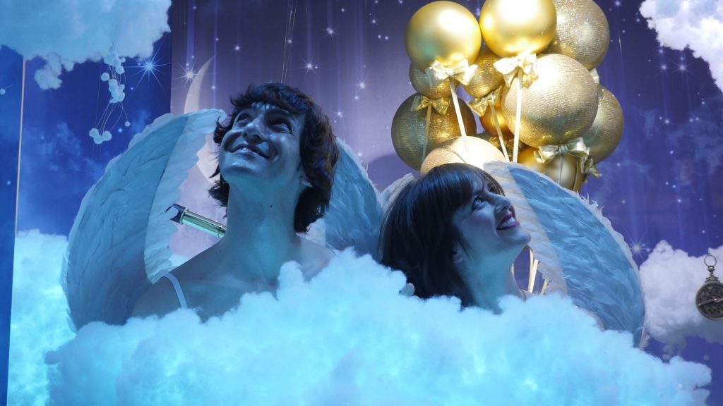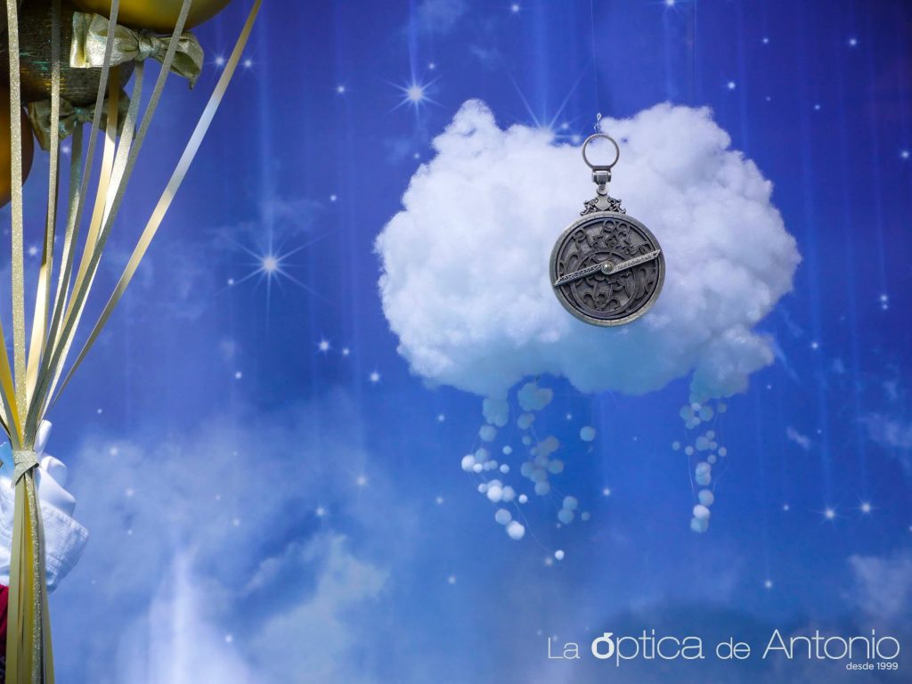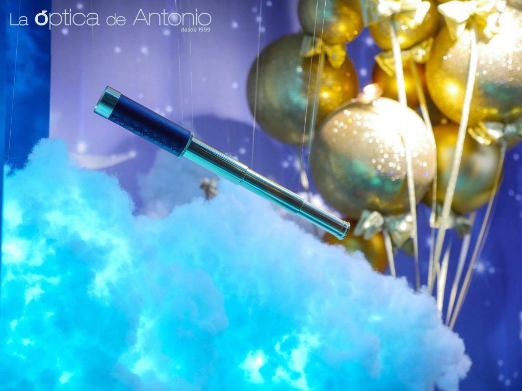 Con la caída de la tarde, el escaparate se transforma por efecto de las luces empleadas. Luces leds en color azul y blanco fría, que consiguen crear una atmósfera crepuscular en la que brillan las diferentes estrellas y la luna. A partir de las 22.30h existe un cambio de iluminación que intensifica la presencia de las nubes y oscurece el fondo dando lugar a una atmósfera diferente, si cabe más mágica.