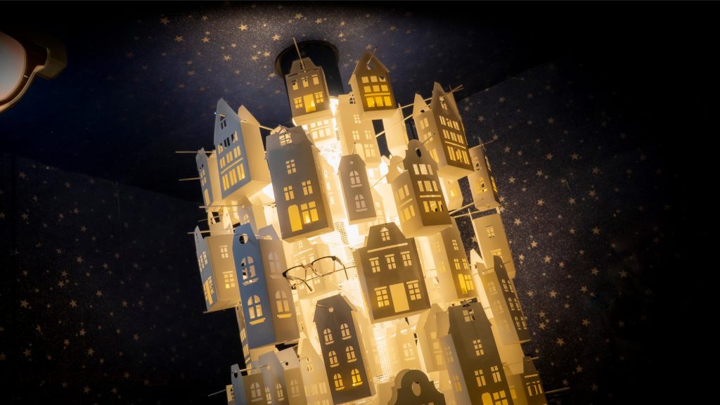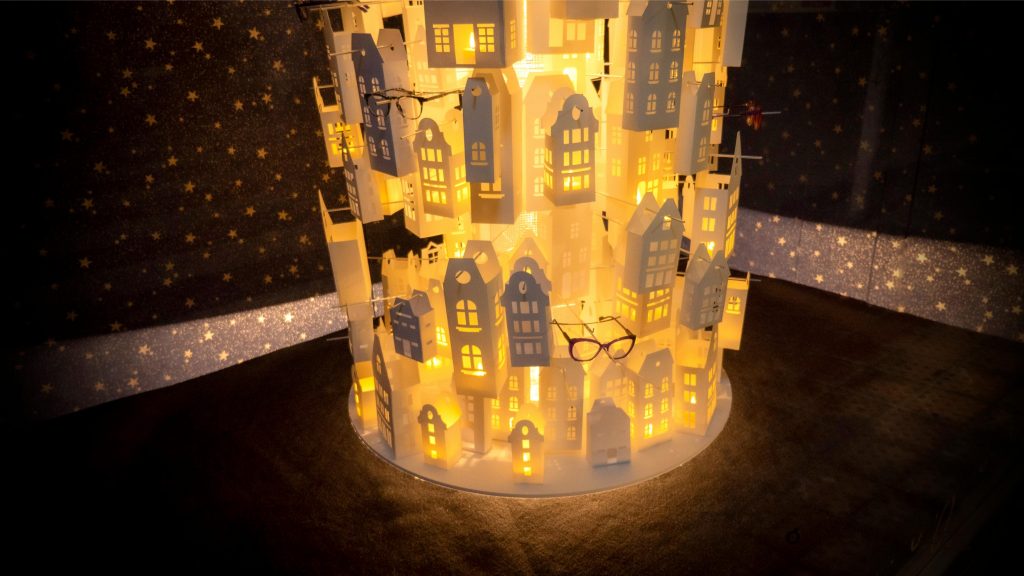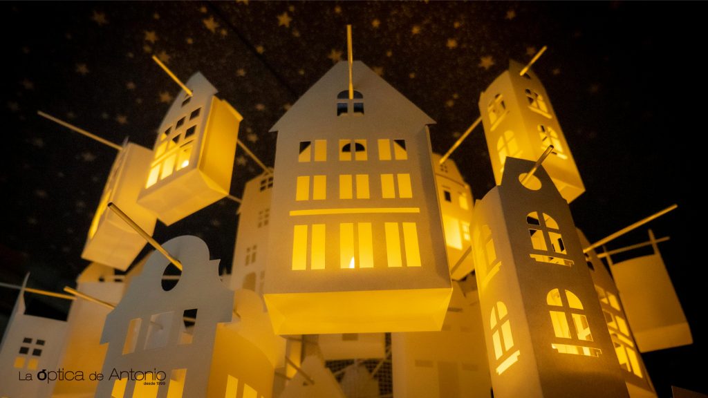 Suenan las primeras notas musicales y una lámpara de dos metros gira con la cadencia propia de una melodía que habla de paz y esperanza. Formada por cientos de casitas de papel, el giro muestra cómo la luz de los hogares sale a través de ventanas, puertas, y balcones. Es la luz de la gente de bien en una noche que habla de reencuentros y de emociones compartidas. Noche de Paz, al ancestral villancico, Patrimonio de la Humanidad, se repite una y otra vez como una nana para dormir al niño que llevamos dentro.