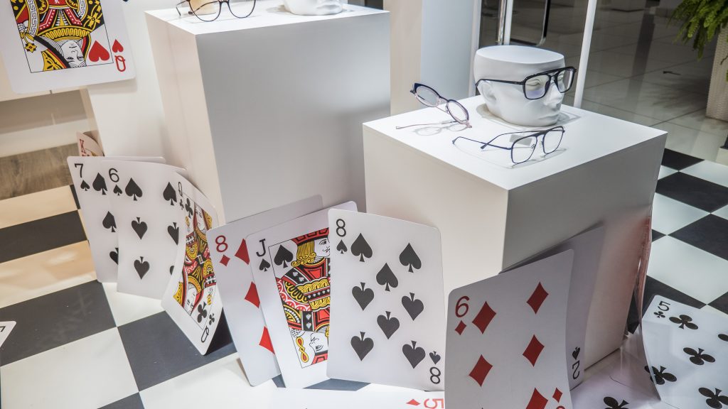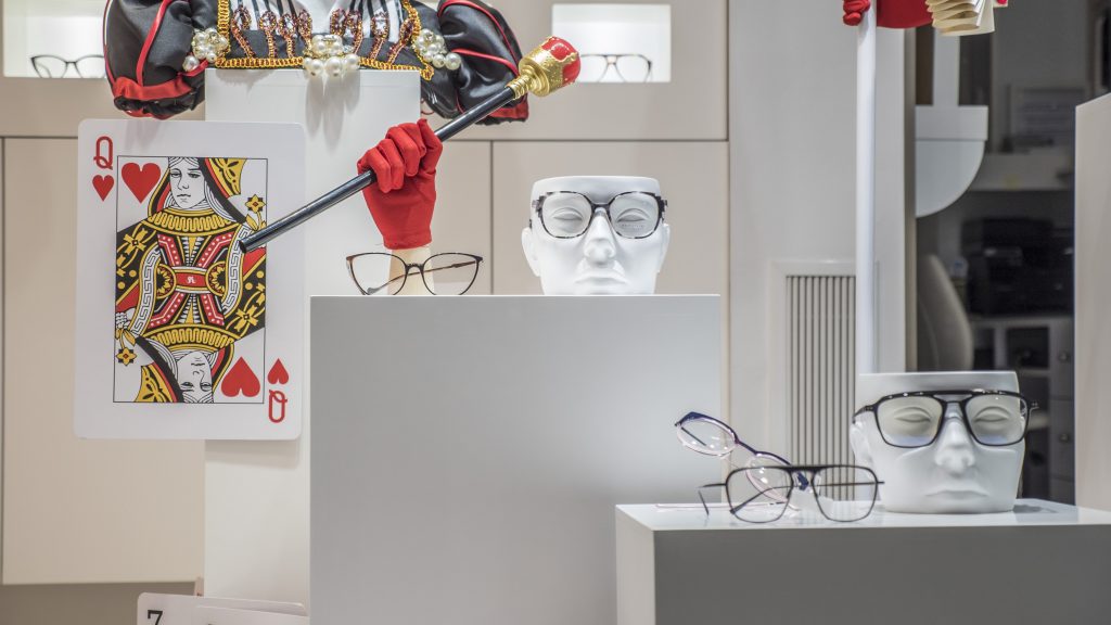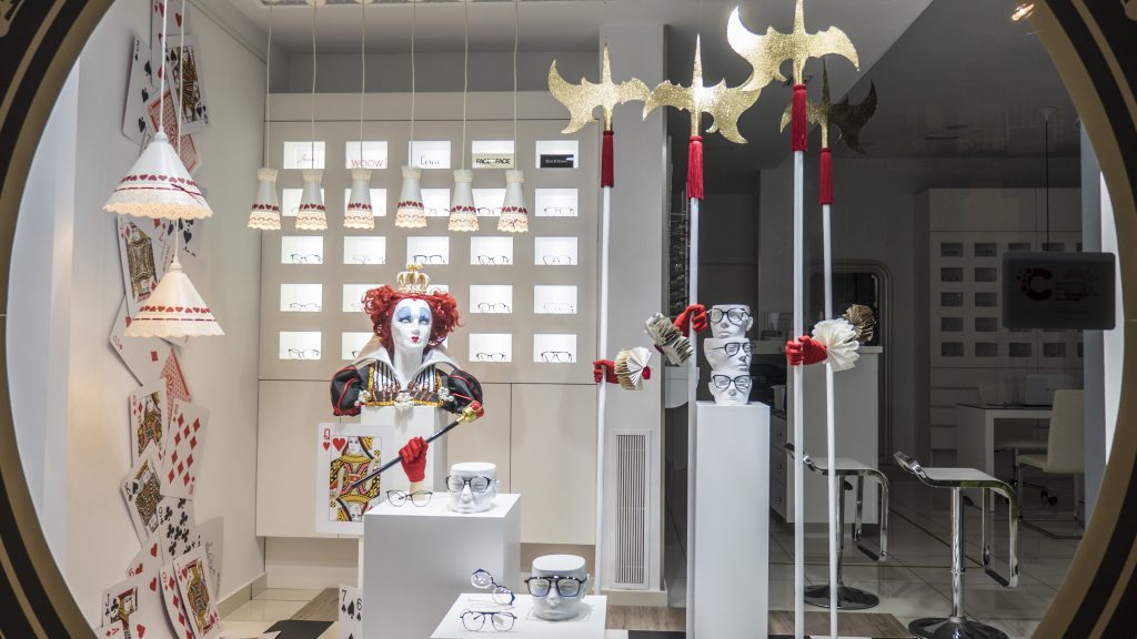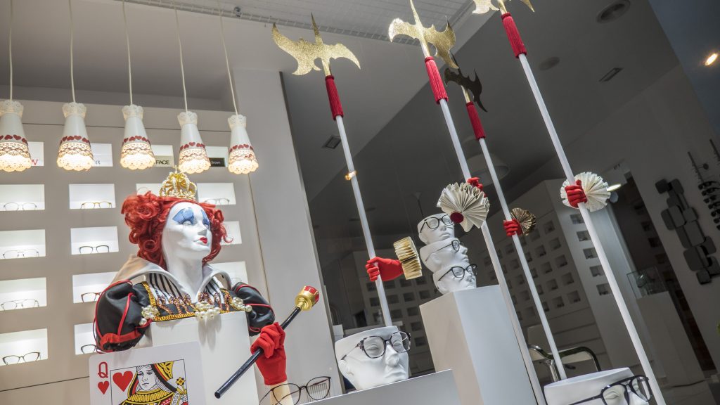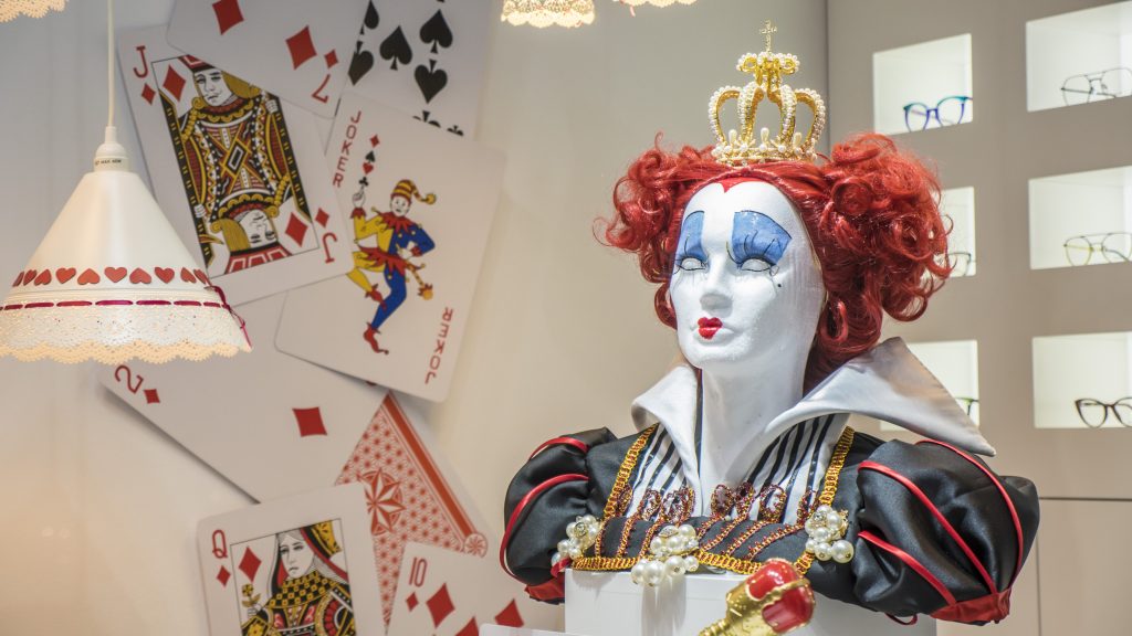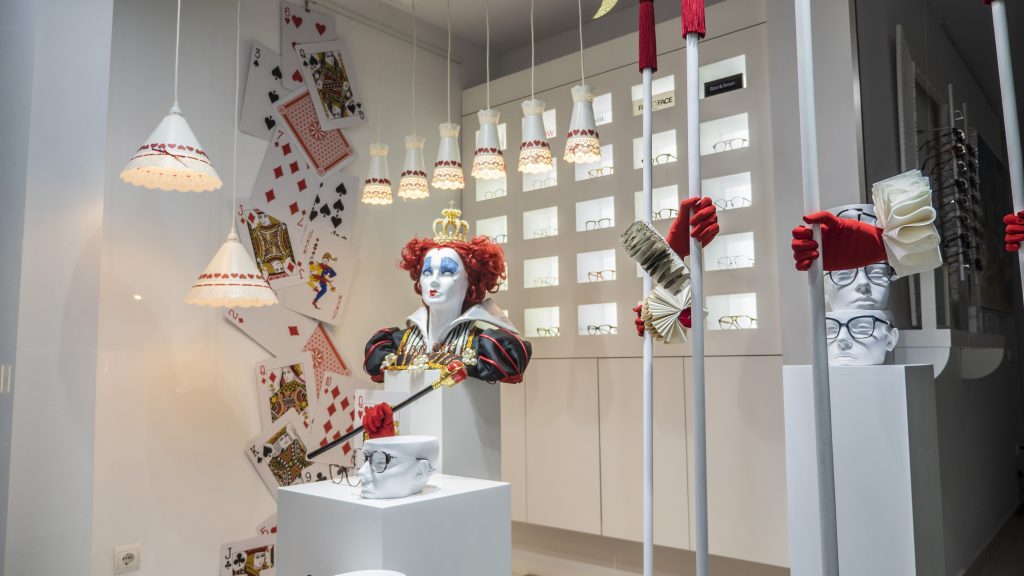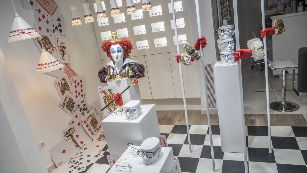 Te presentamos nuestro escaparate especial de «NO FERIA 2020». Basado en el controvertido personaje del cuento de Lewis Carrol: La Reina de Corazones. Hemos utilizado los colores blanco, negro y rojo en la mayoría de los elementos. Como puedes ver en las fotografías, el escaparate sigue un discurso en «V» desde el lateral izquierdo superior, donde parte de la cascada de naipes gigantes. La reina está representada por un busto cuya estética recuerda a la película de Tim Burton.