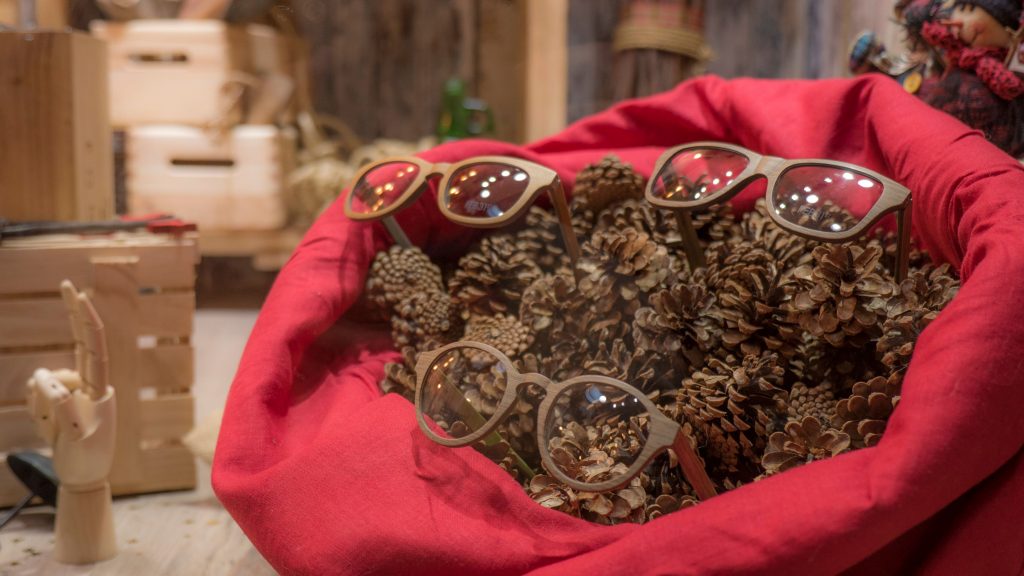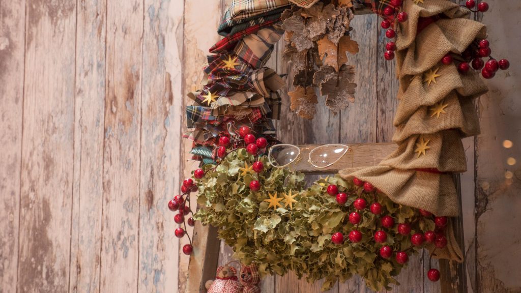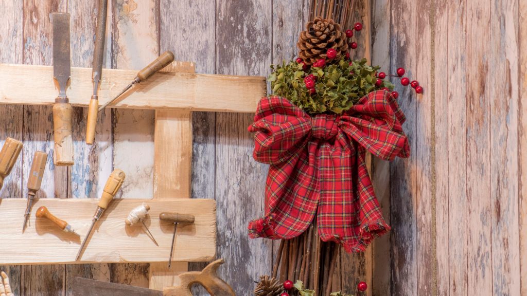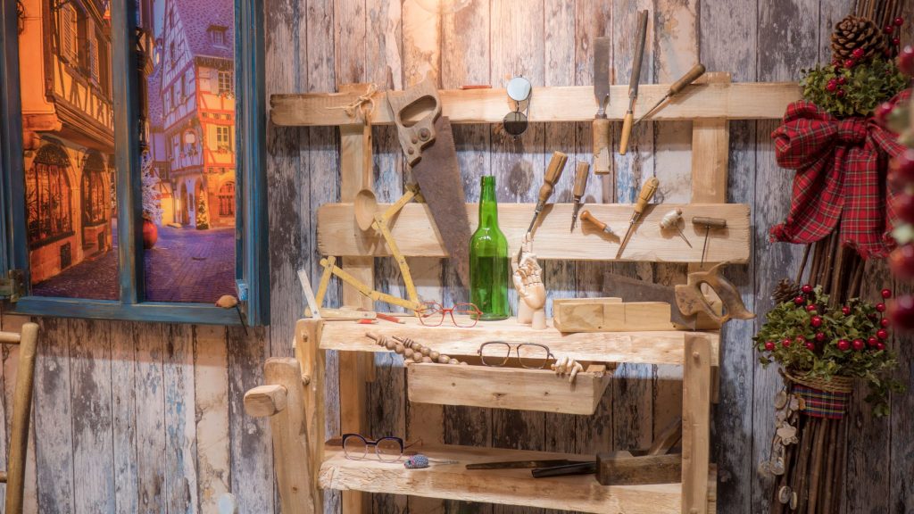 Las cenefas y coronas son un trabajo manual realizado con coscoja y bellotas montadas sobre una malla metálica. El banco de trabajo está manufacturado y envejecido a imagen de los antiguos bancos de carpintero. La ventana deja ver una típica imagen navideña de La Alsacia para crear un punto de fuga y aumentar la sensación de profundidad.