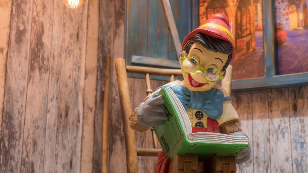Las aventuras de esta traviesa pero ingenua marioneta, hace tiempo que nos cautivaron y por esta razón hemos querido recoger una escena del cuento de Carlo Collodi. En ella, aparece Pinocho repasando la lección en la vieja carpintería de Gepetto.