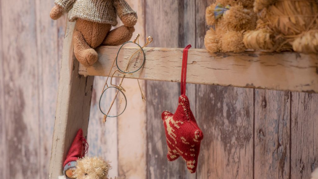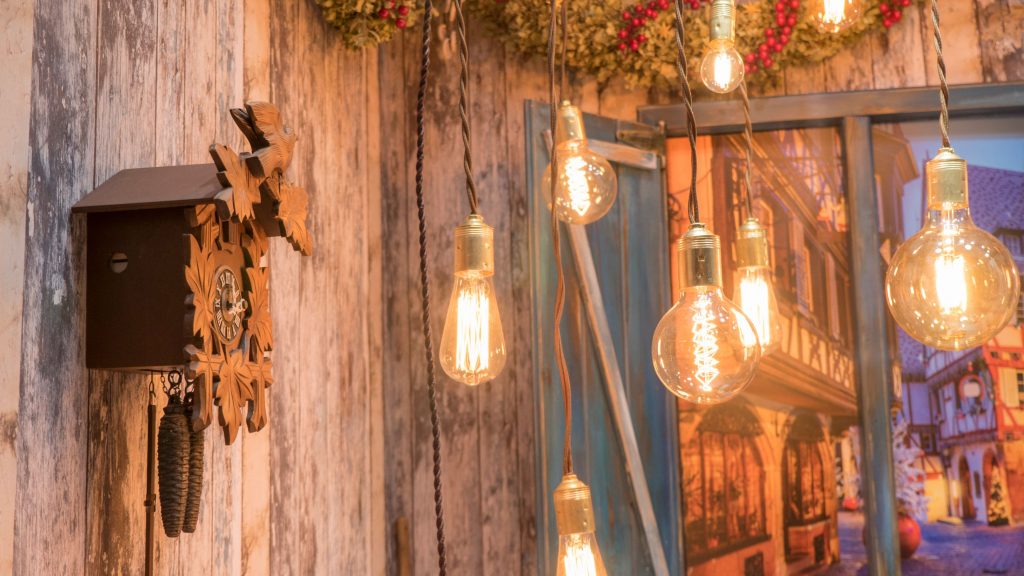 Para potenciar la sensación de escena, hemos cerrado completamente el escaparate. Las paredes de la habitación las hemos decorado con papel de imitación madera. La iluminación es predominantemente cálida, ya que está basada en bombillas de filamento. El cableado de cordón y casquillos de latón acompañan al modesto estilo de la sala. A medida que transcurre la noche, las bombillas y velas están sincronizadas para que se originen diferentes efectos de iluminación que enfatizan si cabe aún más, la calidez de la escena.