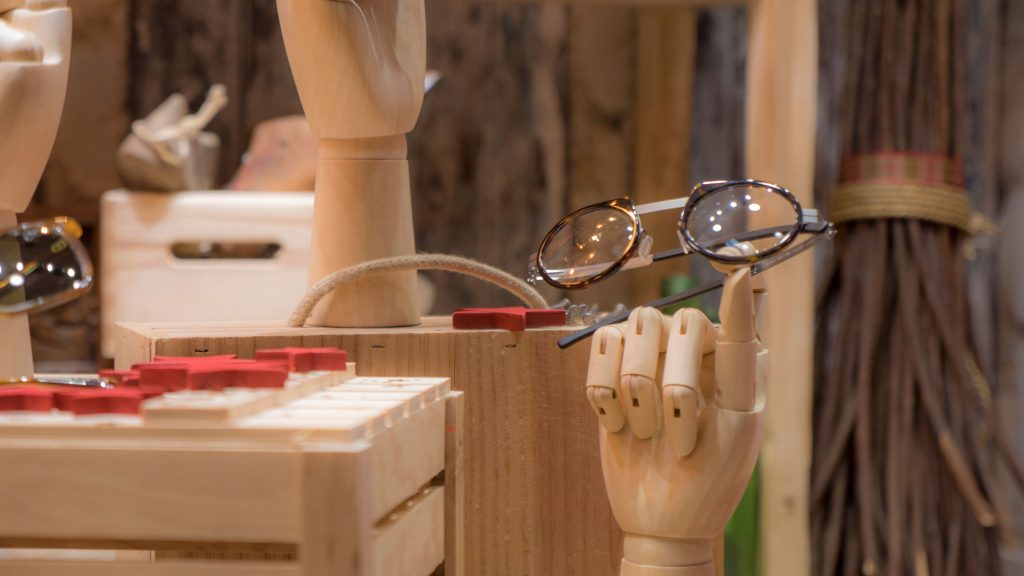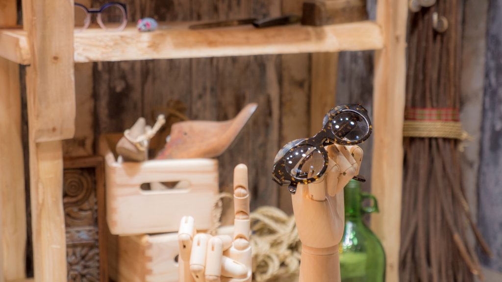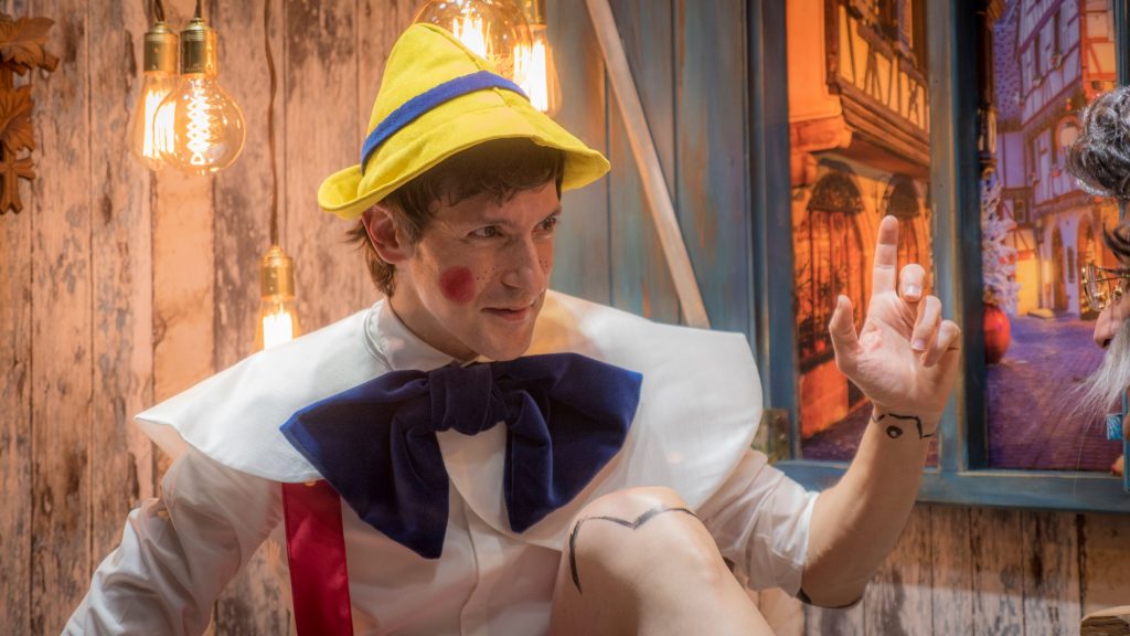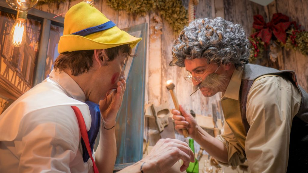 Tanto la figura de Pinocho como muchos de los elementos (la maleta, la silla, la escalera, los relojes y las herramientas…) son piezas de anticuario de entre los años 20 a los 60.