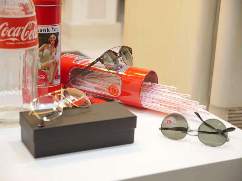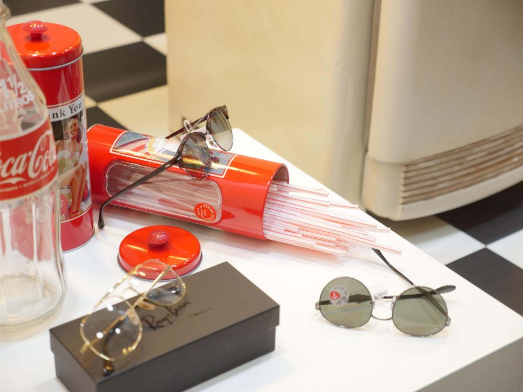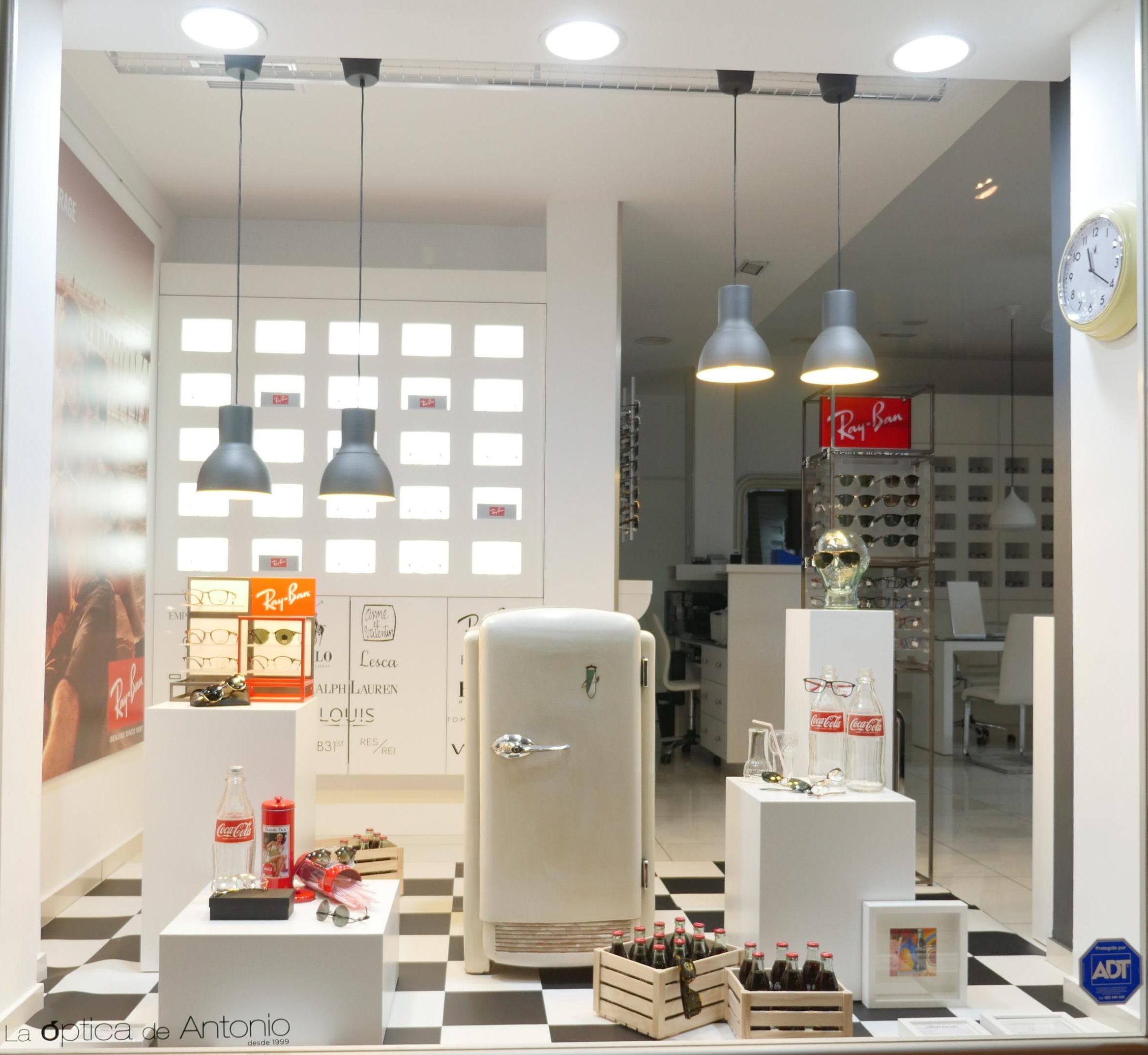 Con la intención de transmitir una sensación de frío hemos montado este escaparate, ideal para combatir el calor del verano. Hablar de refrescos nos hace pensar en la archiconocida Coca-Cola ya que encontramos ciertos paralelismos con Ray-Ban, otra marca americana consagrada. Por esta razón, hemos unido ambos productos.