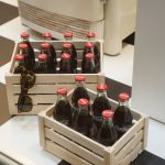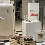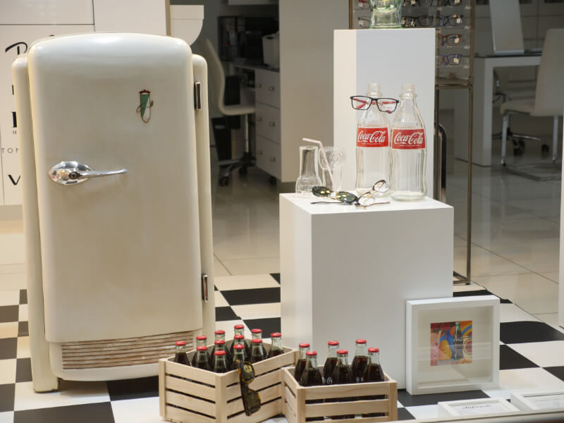 El elemento principal en este escaparate es una original fresquera blanca de los años 40, situada sobre un suelo vinílico en damero blanco y negro, hace que la escena se identifique con una cocina. Esparcidas por el suelo aparecen cajas de madera con botellines de Coca-Cola, incluso un cubo de latón lleno de cubitos de hielo artificiales.