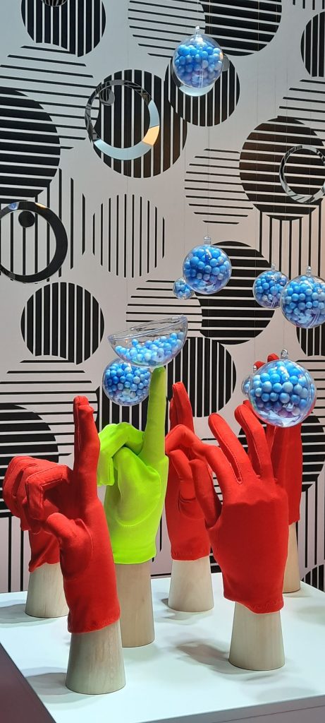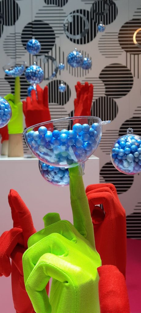 Para mejorar la visibilidad de estas esferas y semiesferas transparentes, hemos introducido un relleno de bolitas de poliestireno azul evocando el polímero utilizado en su fabricación.