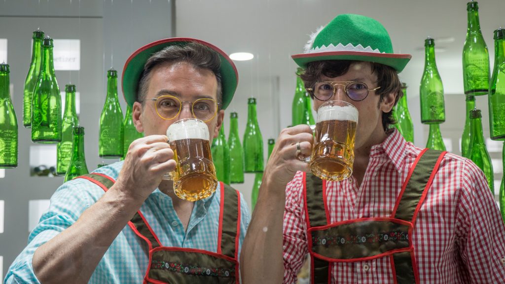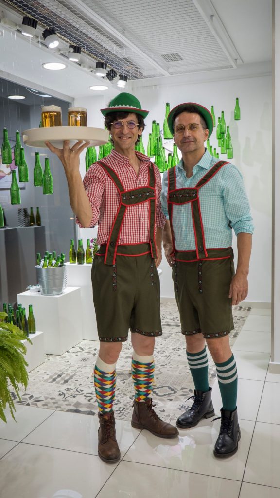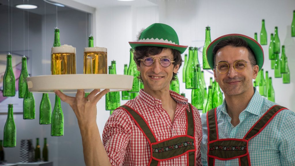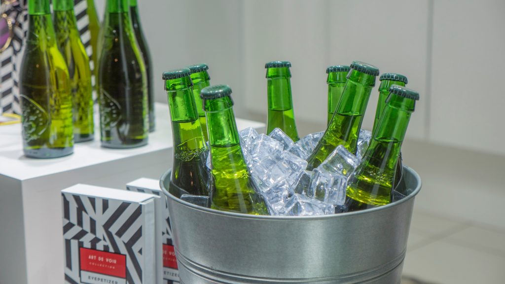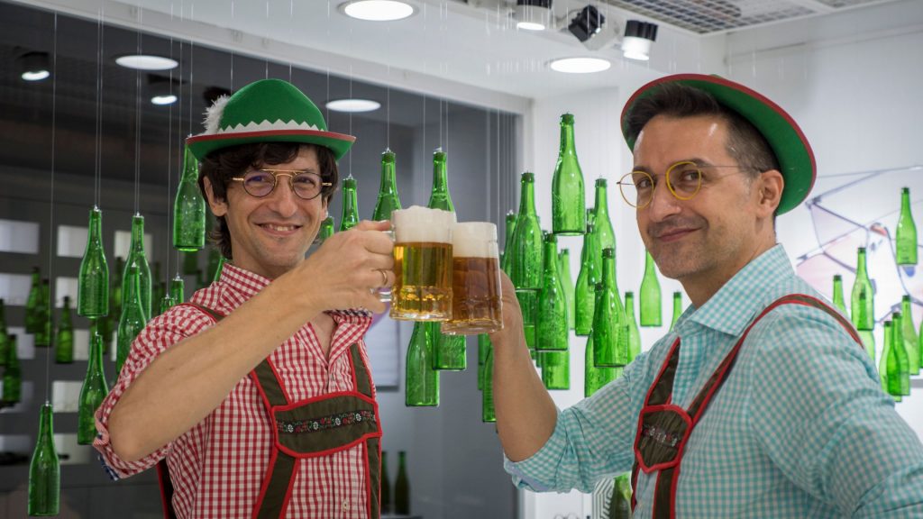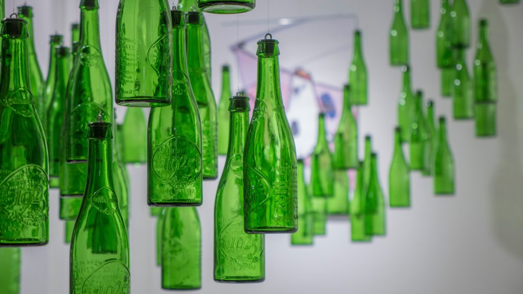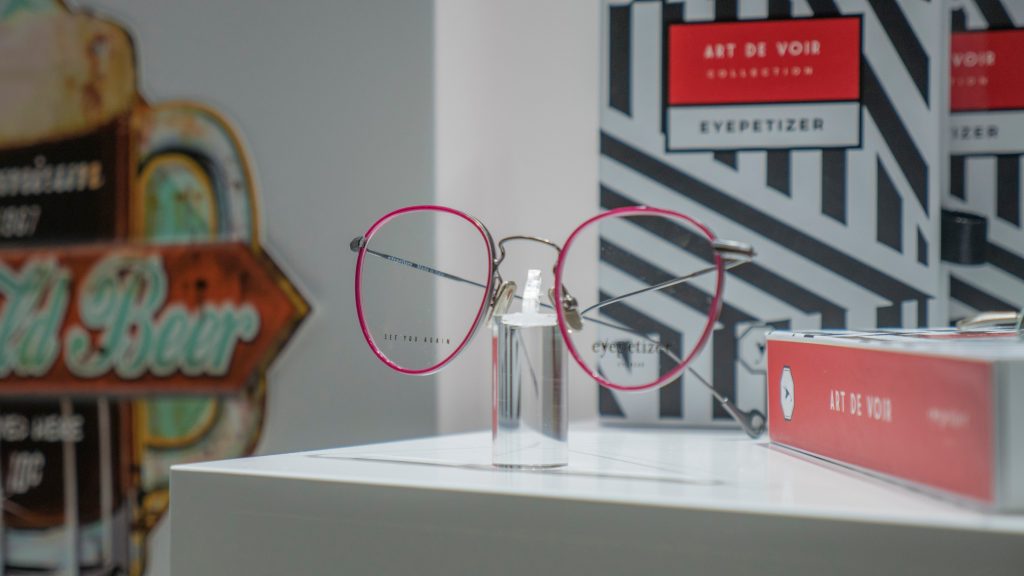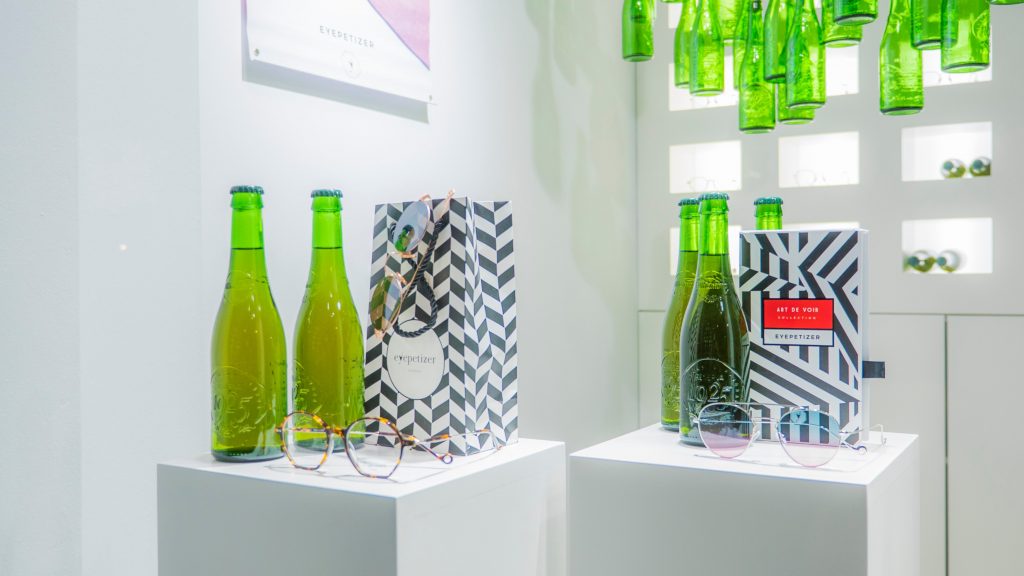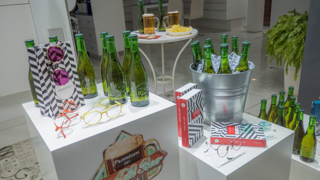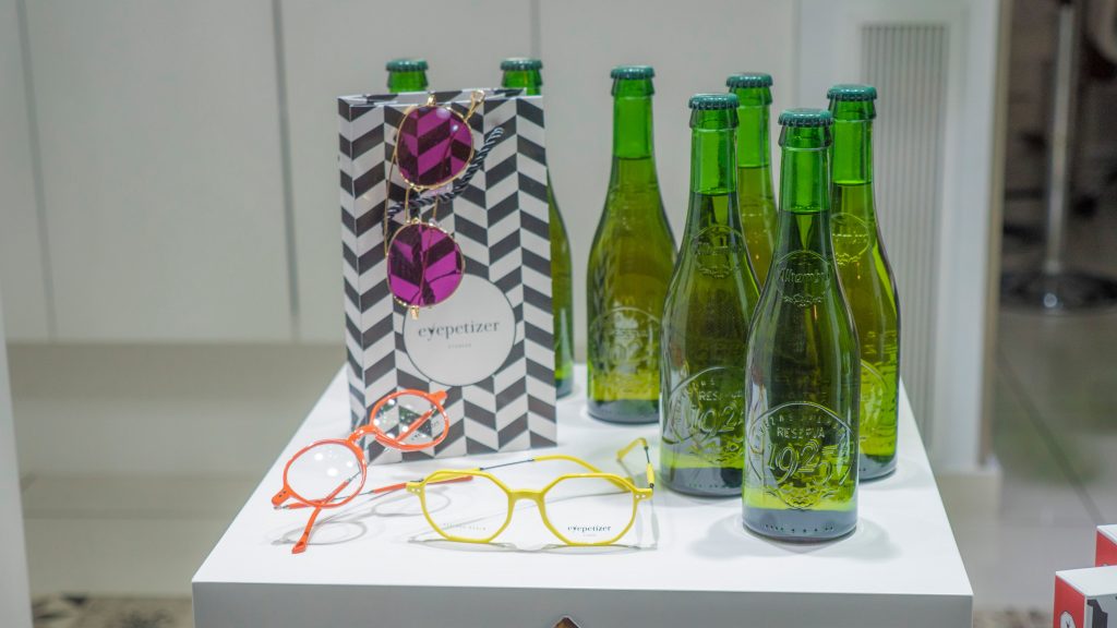En nuestro escaparate de verano hemos utilizado la técnica de repetición de elementos en un espacio, lo que genera una sensación de continuidad y movimiento que llama la atención del espectador/a. Inspirados en las terrazas de verano y en la hora del aperitivo, hemos instalado esta escultura aérea formada por un único modelo de botella de cerveza. El juego de brillos y colores generados por el vidrio verde, resulta muy llamativo ya que depende de la ubicación, del fondo y de si el envase se encuentra lleno o vacío. El escaparate presenta una colección divertida y fresca, como no podía ser de otro modo, @Eyepetizer es la gafa por excelencia para un montaje de este tipo. Esperamos que lo disfrutes y por supuesto te invitamos a conocerlo en persona 😉