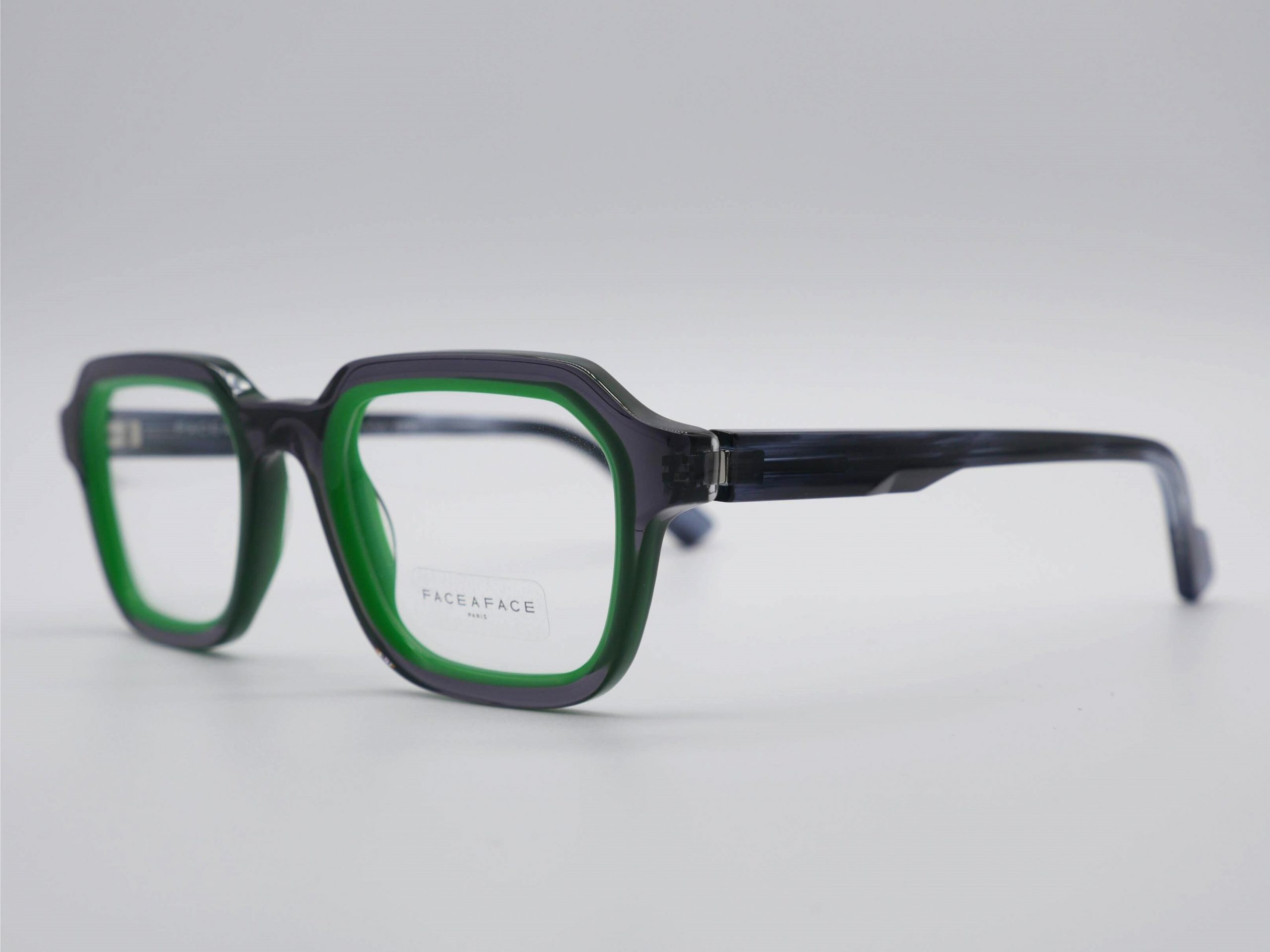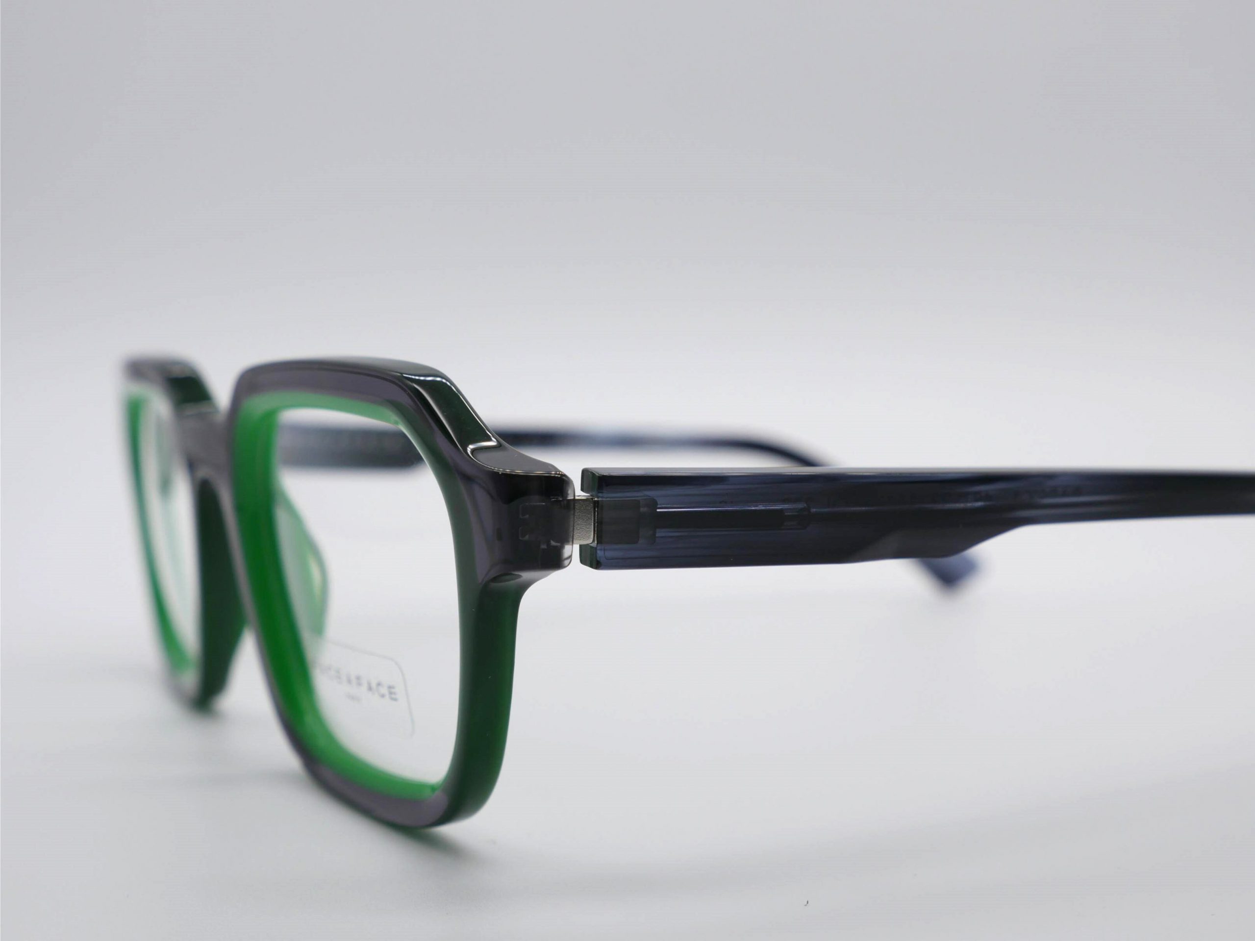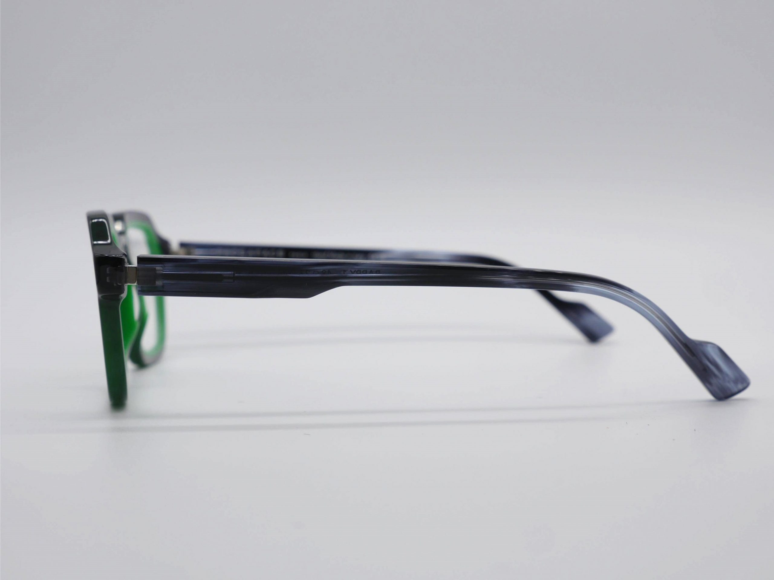 Este modelo masculino, esculpido en acetato de alta densidad, presenta un vibrante gris profundo con matices translúcidos que aporta frescura y una luminosidad magnética a la mirada, rompiendo con la sobriedad convencional con un aro de verde intenso.