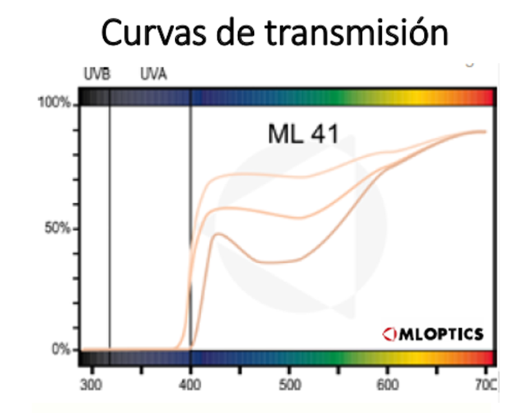 Lentes: Filtro selectivo ML 41 de color rosado. Bloquea el 80% del componente de la radiación azul en interiores, reduce los molestos síntomas visuales provocados por el parpadeo de la luz artificial. Avalado por estudios clínicos para el tratamiento de la fotofobia, migrañas y blefaroespasmos mediante el bloqueo de longitudes de onda azul y verde.