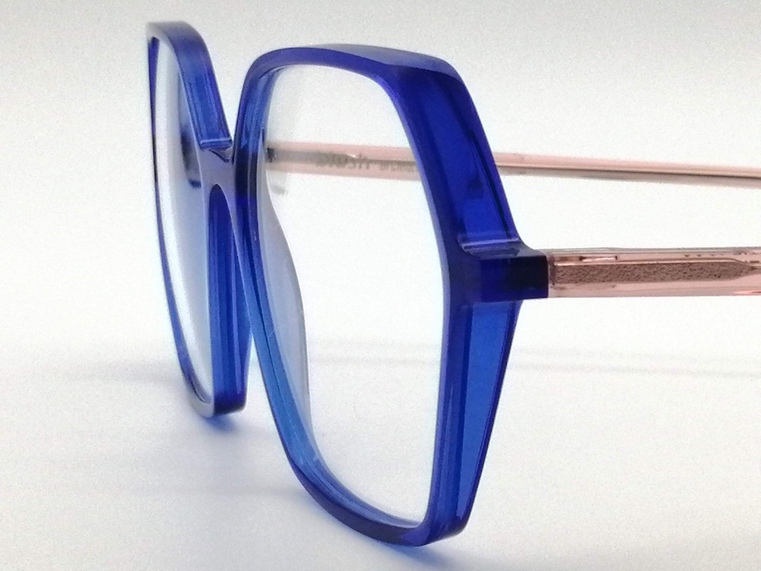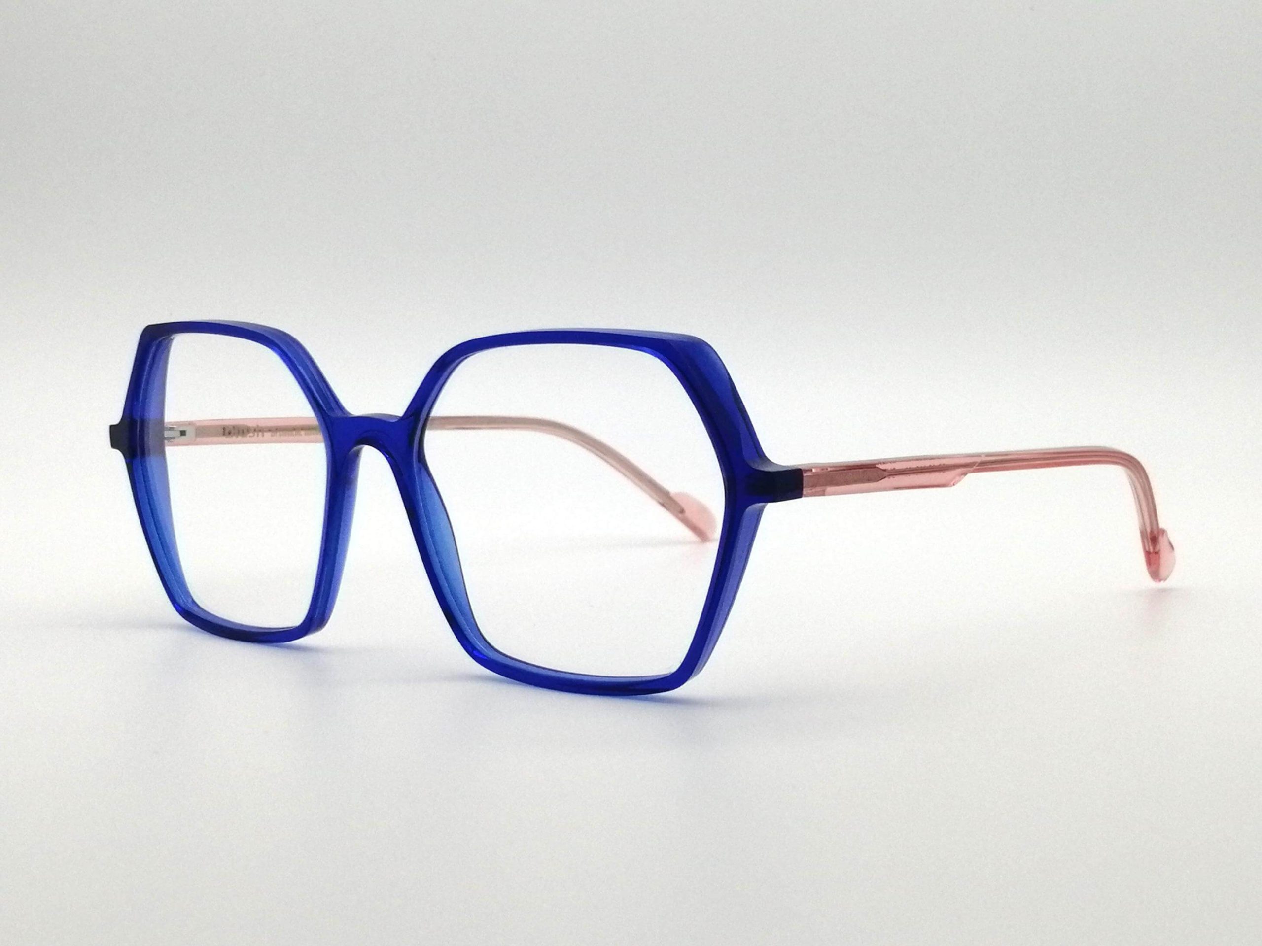 Esta montura femenina cautiva con su silueta hexagonal geométrica, esculpida en un vibrante acetato azul eléctrico translúcido. El contraste con las varillas en tono rosa empolvado aporta una frescura única, creando un juego cromático que ilumina la mirada y proyecta una personalidad audaz y sofisticada.