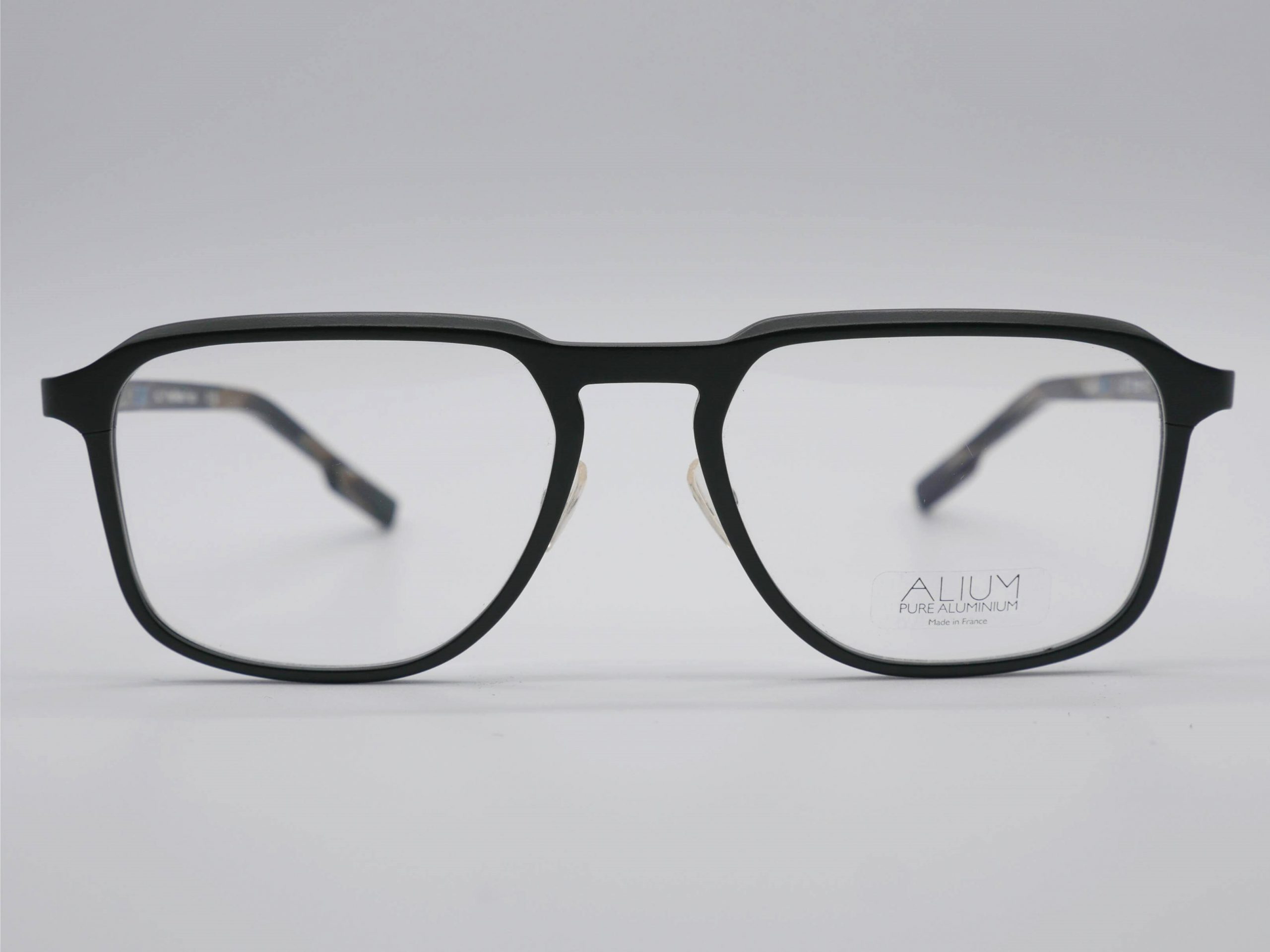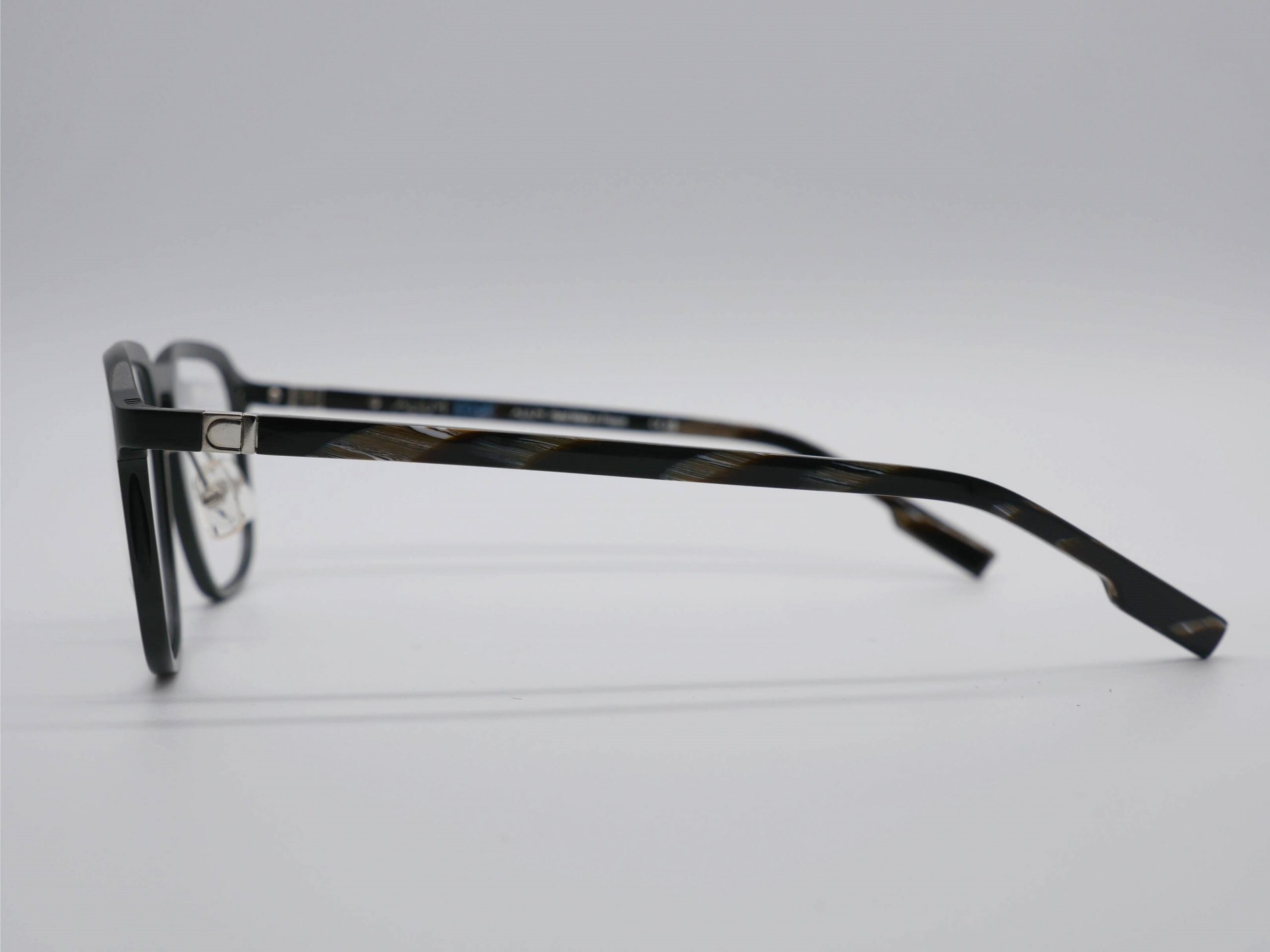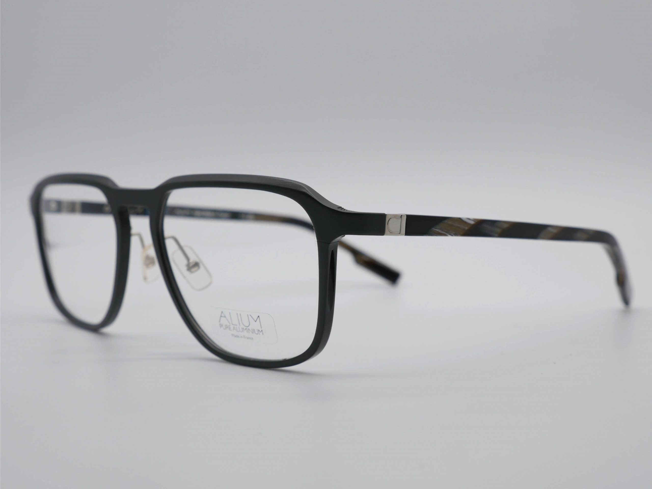Diseñada para el hombre de gusto exigente, esta montura destaca por su frontal de aluminio puro en un impecable negro mate. El contraste se revela en sus varillas de acetato con un patrón lineal en tonos grises y ocres, que suavizan la estructura y aportan un matiz orgánico a una mirada de carácter decidido y rectilíneo.