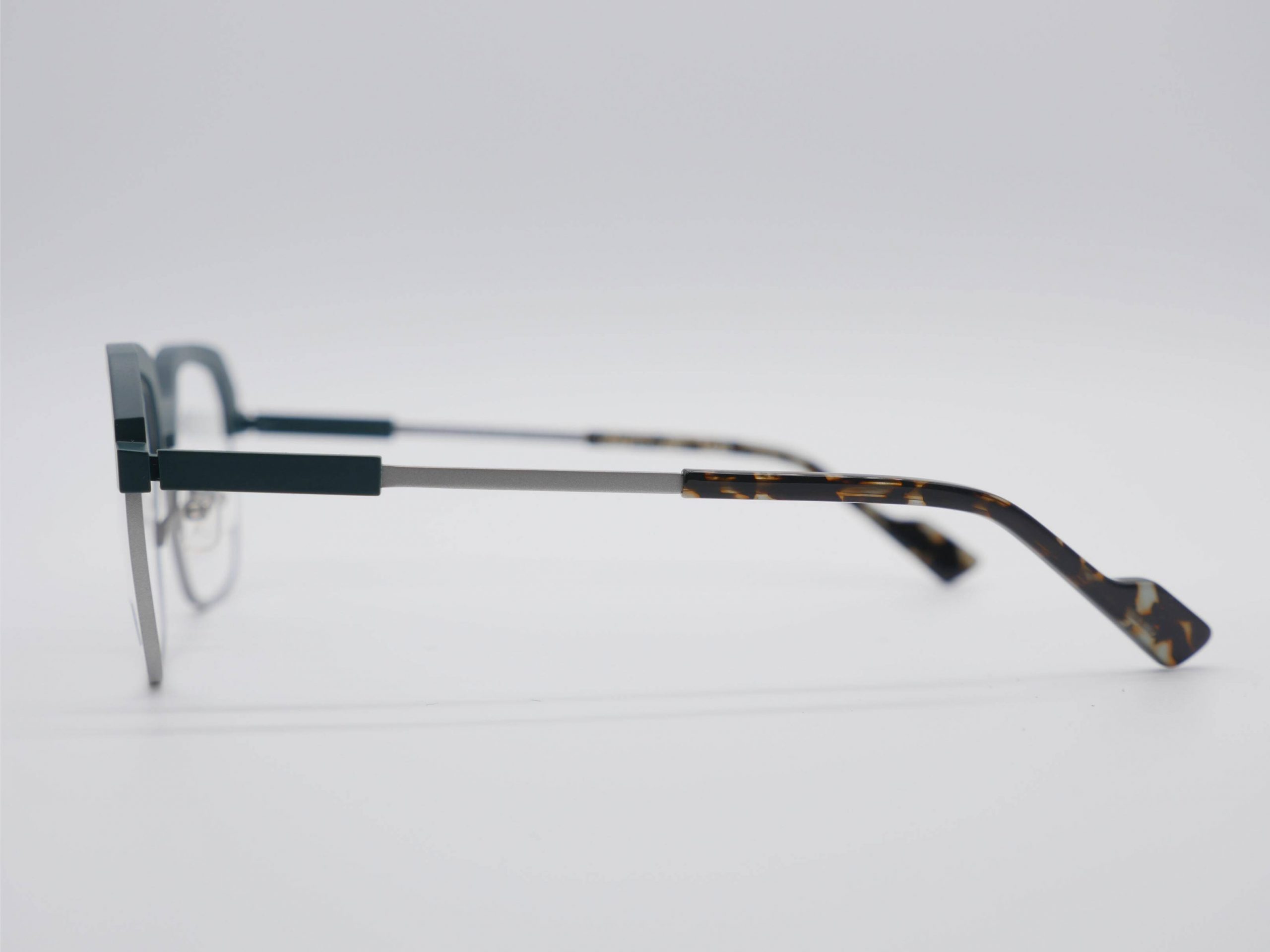 Esta montura masculina, manufacturada en titanio destaca por un juego cromático donde el gris ahumado se combina con verde. Su diseño de líneas contundentes y volúmenes arquitectónicos aporta una profundidad inigualable a la mirada, proyectando una imagen de audacia culta y serenidad.
