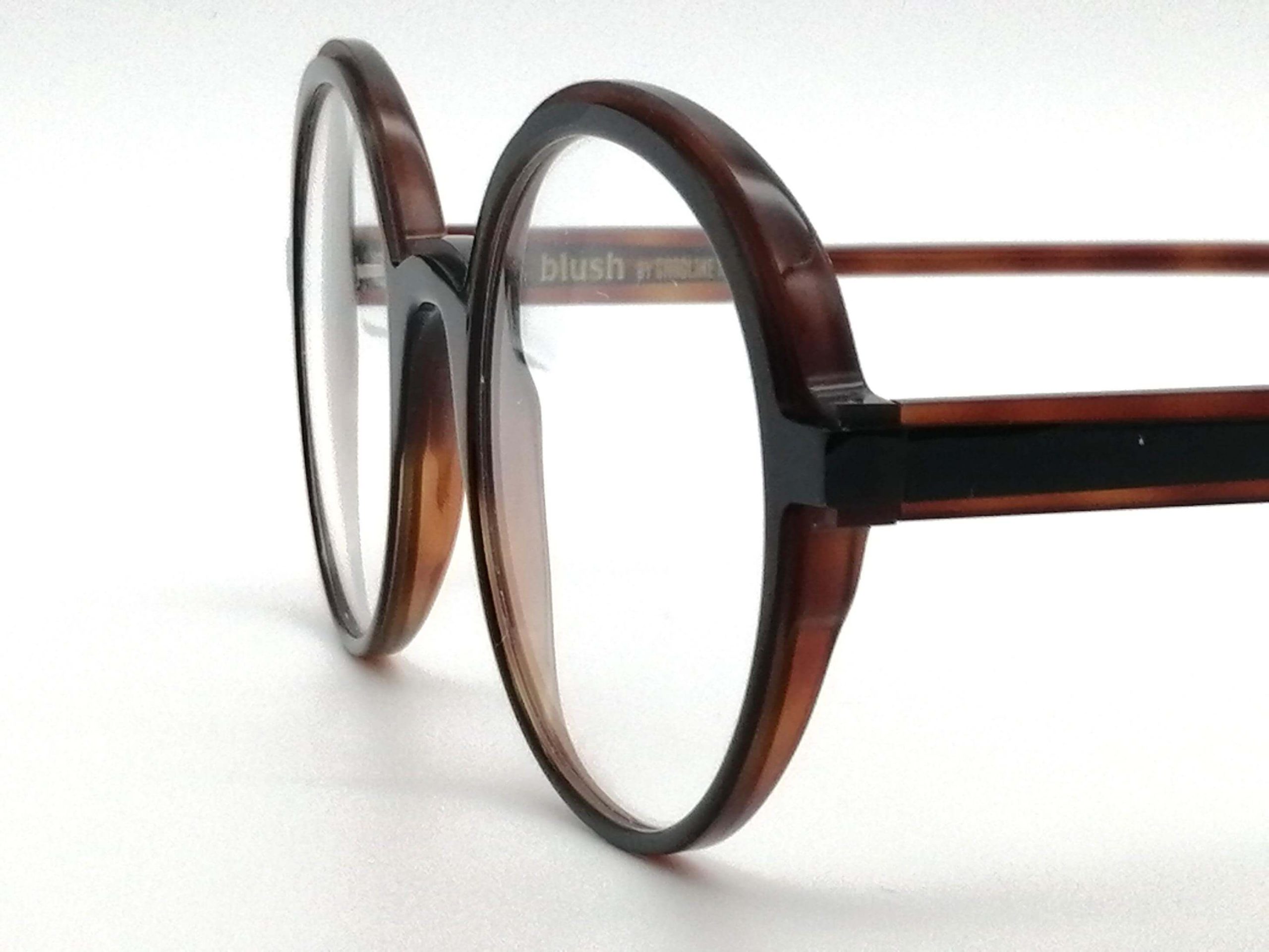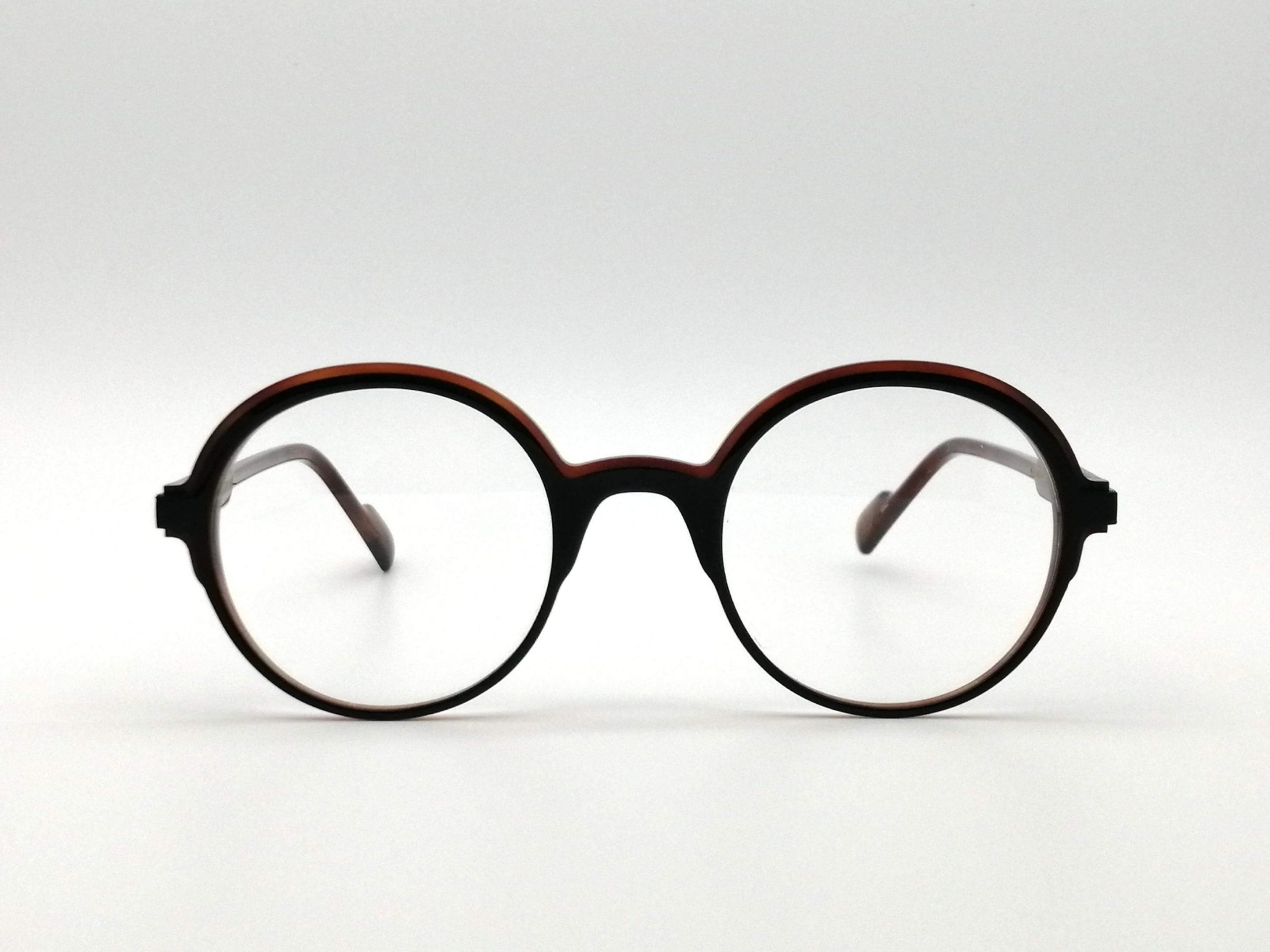 Esta montura femenina cautiva por su silueta redonda de inspiración intelectual, esculpida en un acetato bicapa excepcional. El diseño juega con un contraste sofisticado: un frontal oscuro que enmarca la mirada, fusionado con un tono habana rojizo translúcido en la parte superior e interna que aporta calidez y una luminosidad vibrante al rostro.