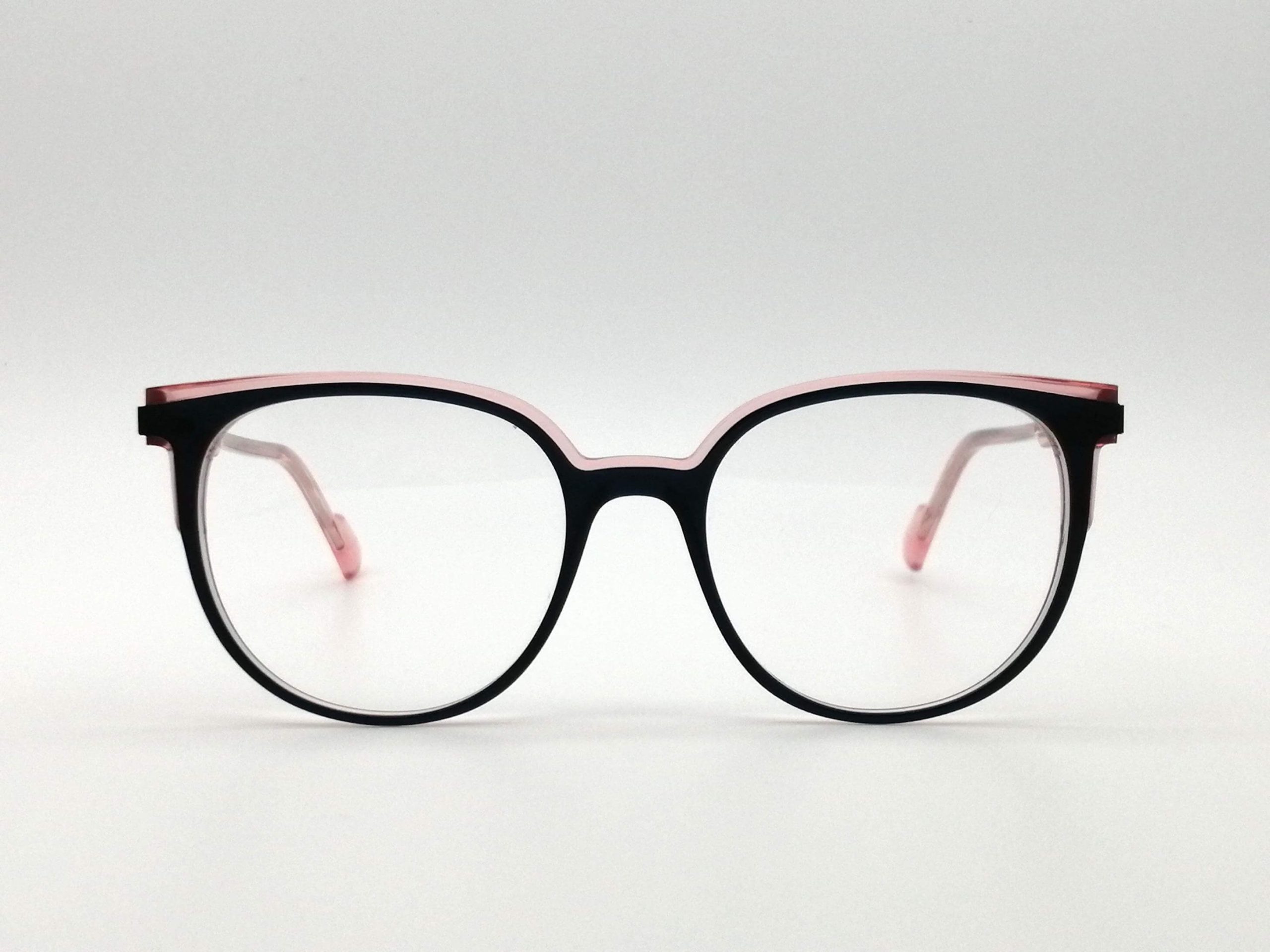 Esta montura femenina, esculpida en acetato de alta densidad, destaca por su cautivador tono azul oscuro y rosa translúcido. El juego de transparencias aporta una luminosidad única al rostro, mientras que su silueta panto ligeramente ascendente define una mirada audaz y sofisticada.