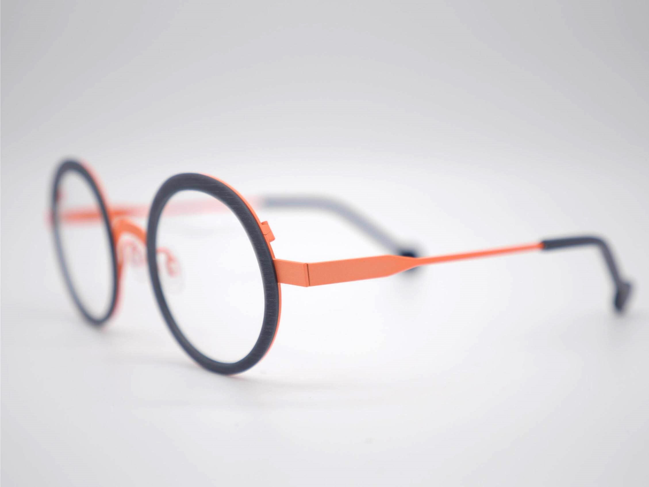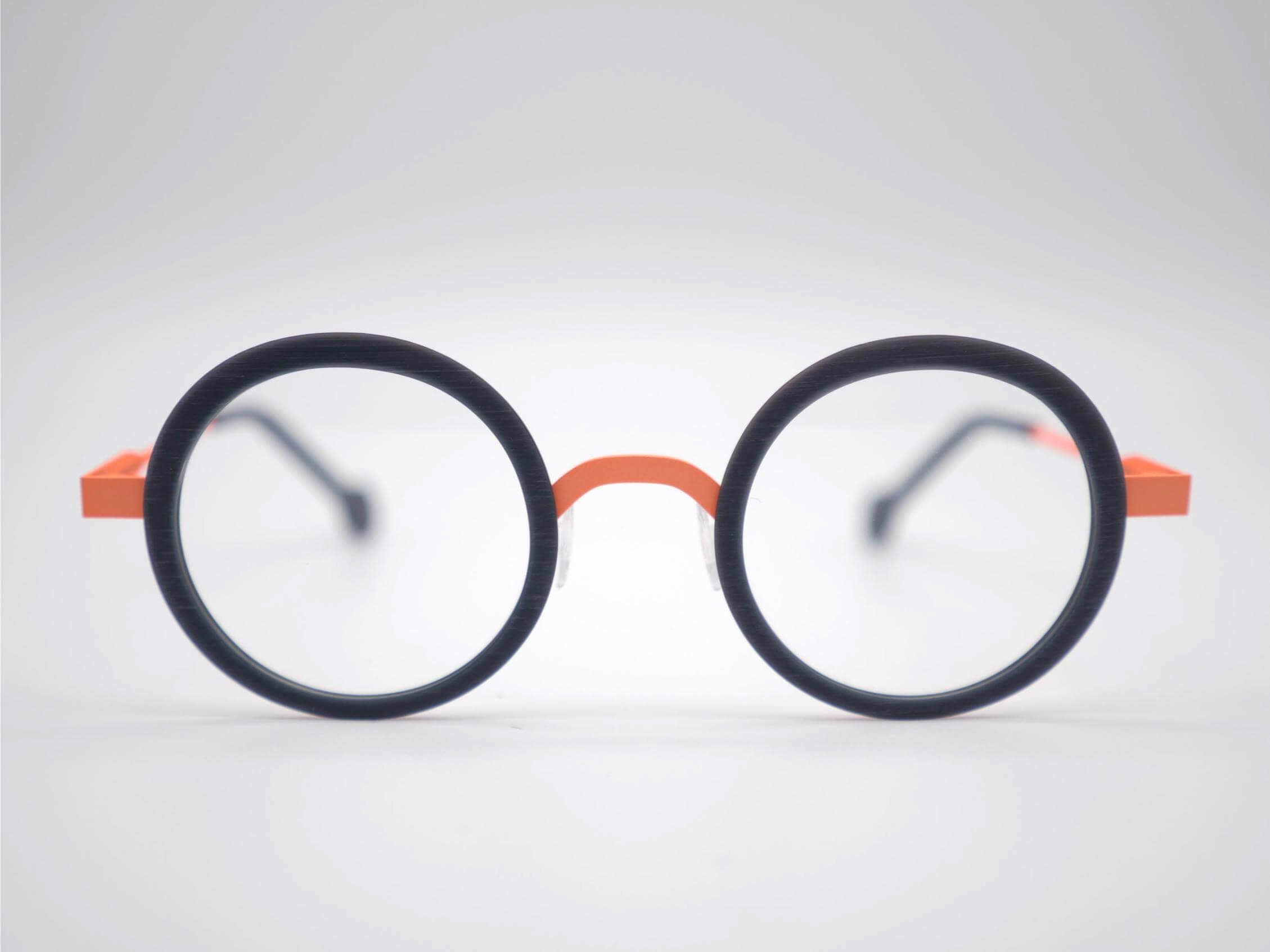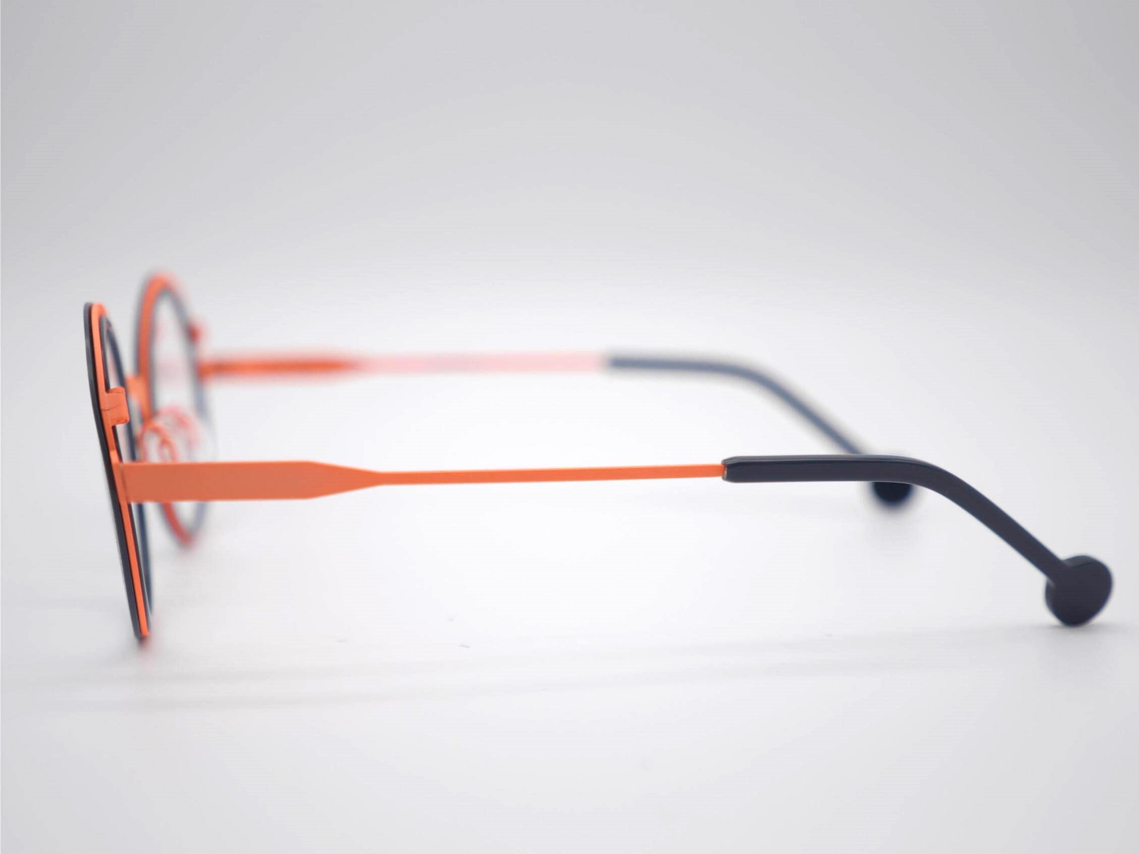 Esta montura unisex cautiva por su arquitectura de metal y acetato premium en una sofisticada combinación bicolor. Presenta un aro superior en un refinado azul oscuro, que contrasta dinámicamente con una parte inferior en naranja flúor. Su diseño redefine las facciones, otorgando un aire intelectual, chic y profundamente original a quien las luce.