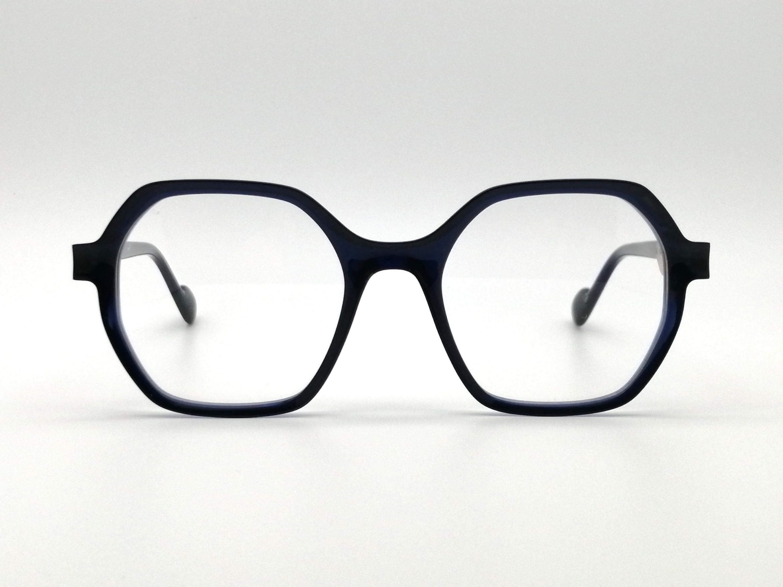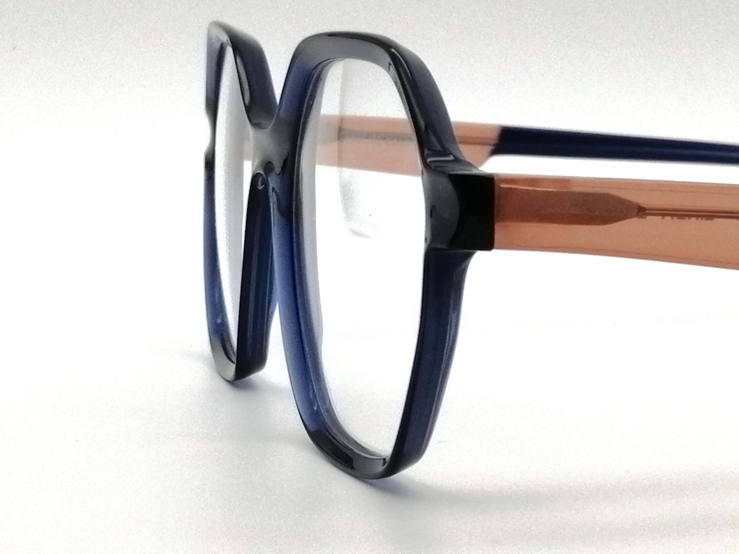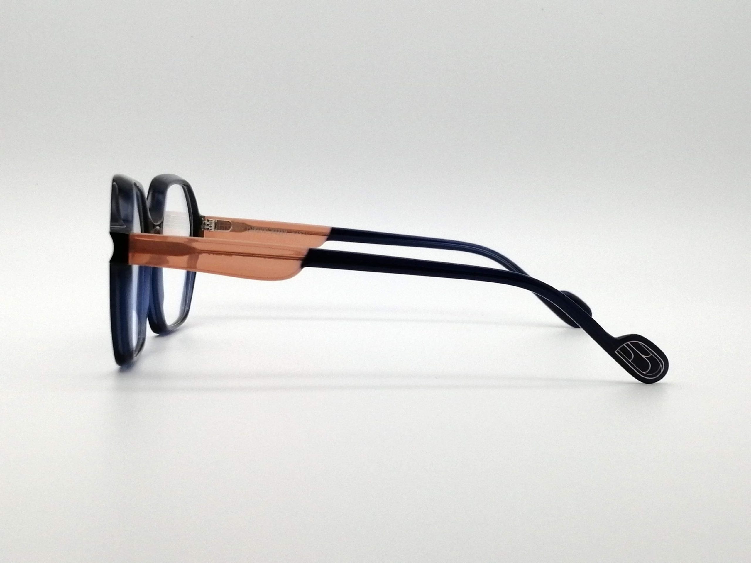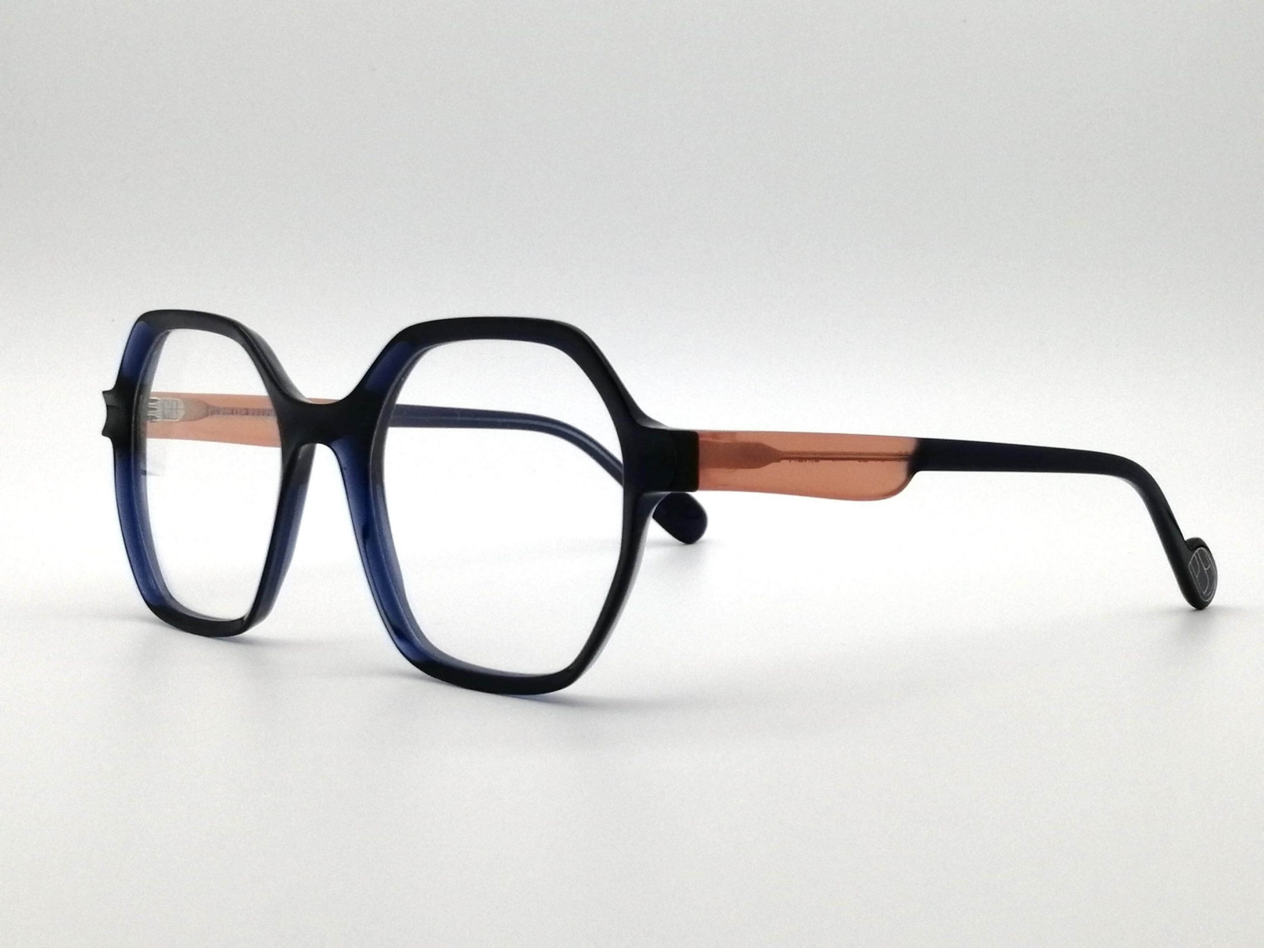 Especialmente creada para la mujer audaz, esta montura destaca por su acetato de alta calidad en una exquisita combinación de tonos azules y rosa translúcido. Su silueta poligonal de líneas gráficas y volúmenes tridimensionales aporta una frescura magnética, realzando la expresión con un toque de luz que ilumina el rostro y define un carácter cosmopolita y refinado.