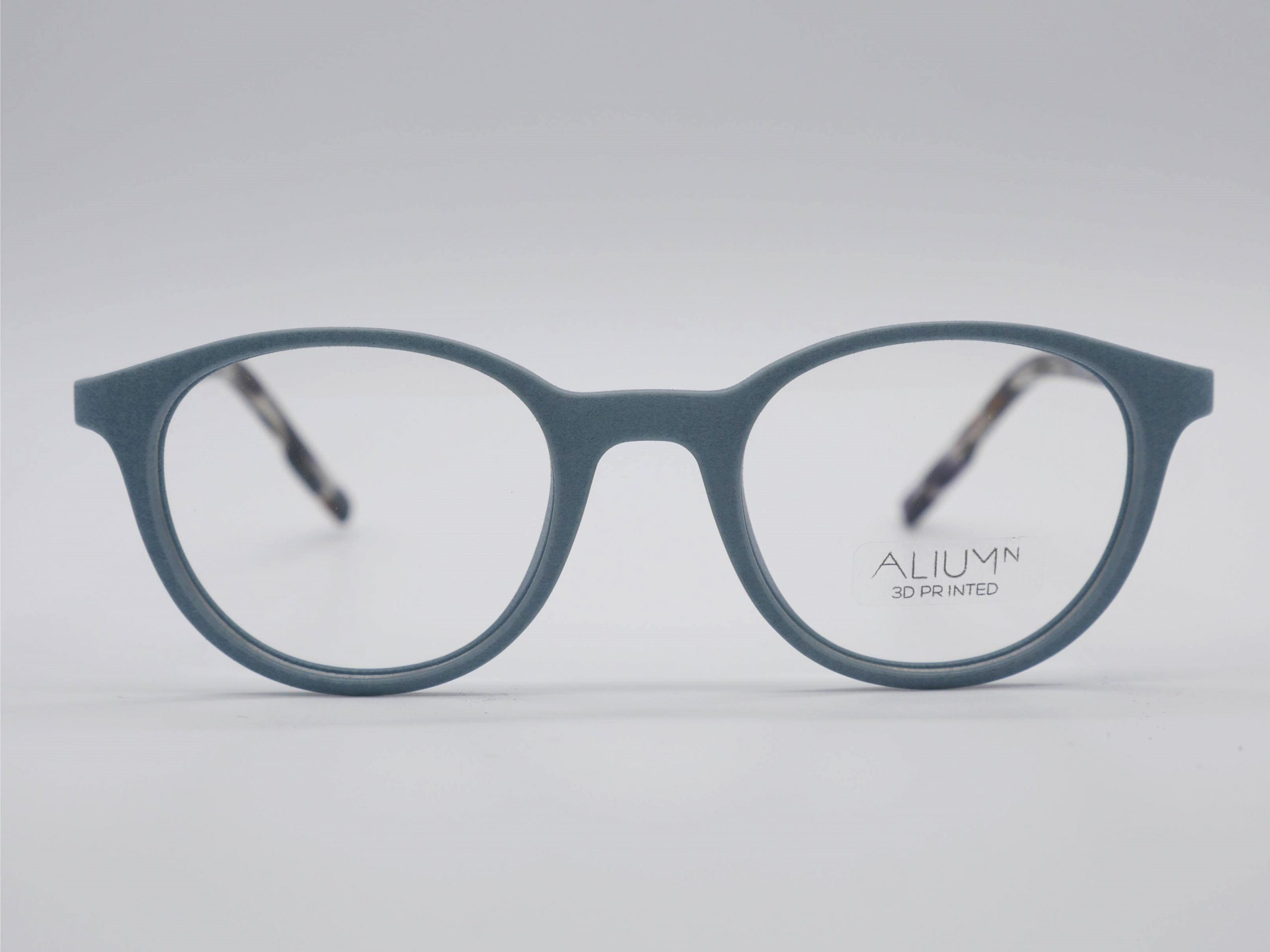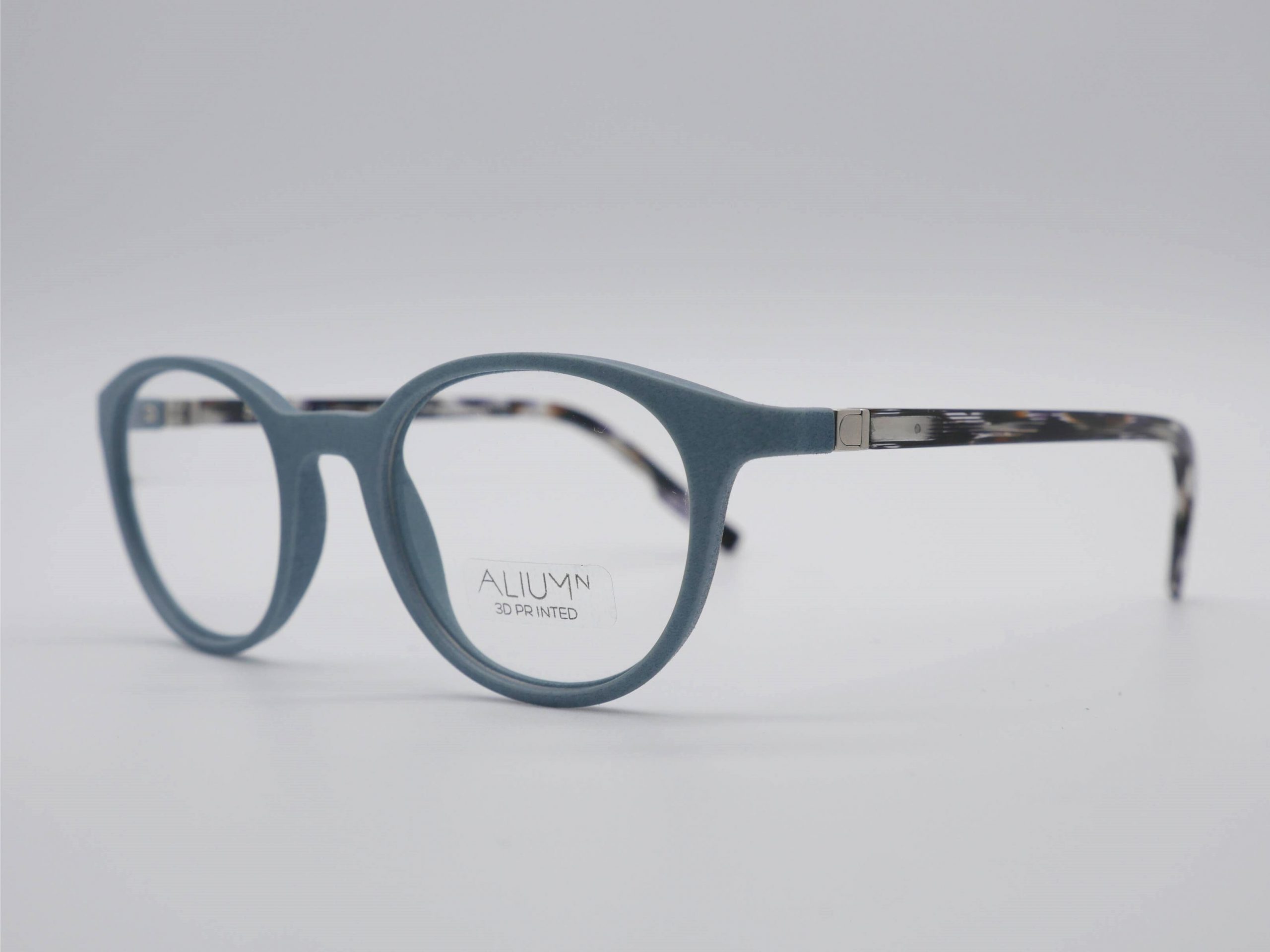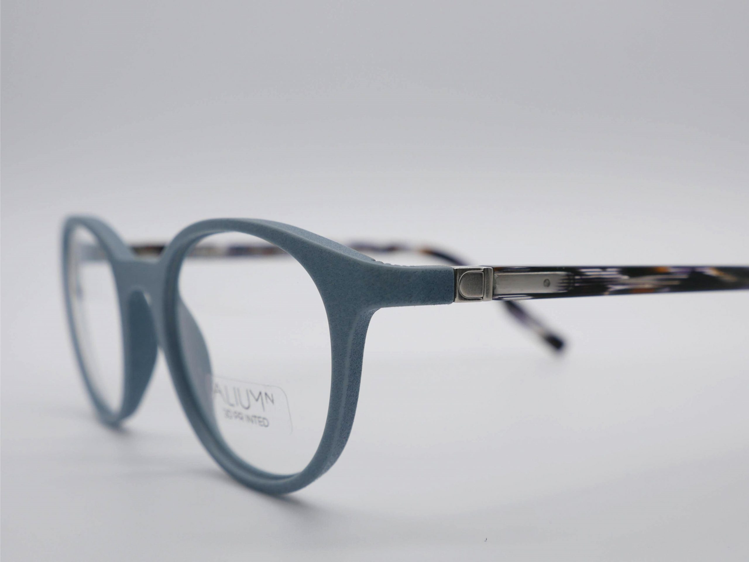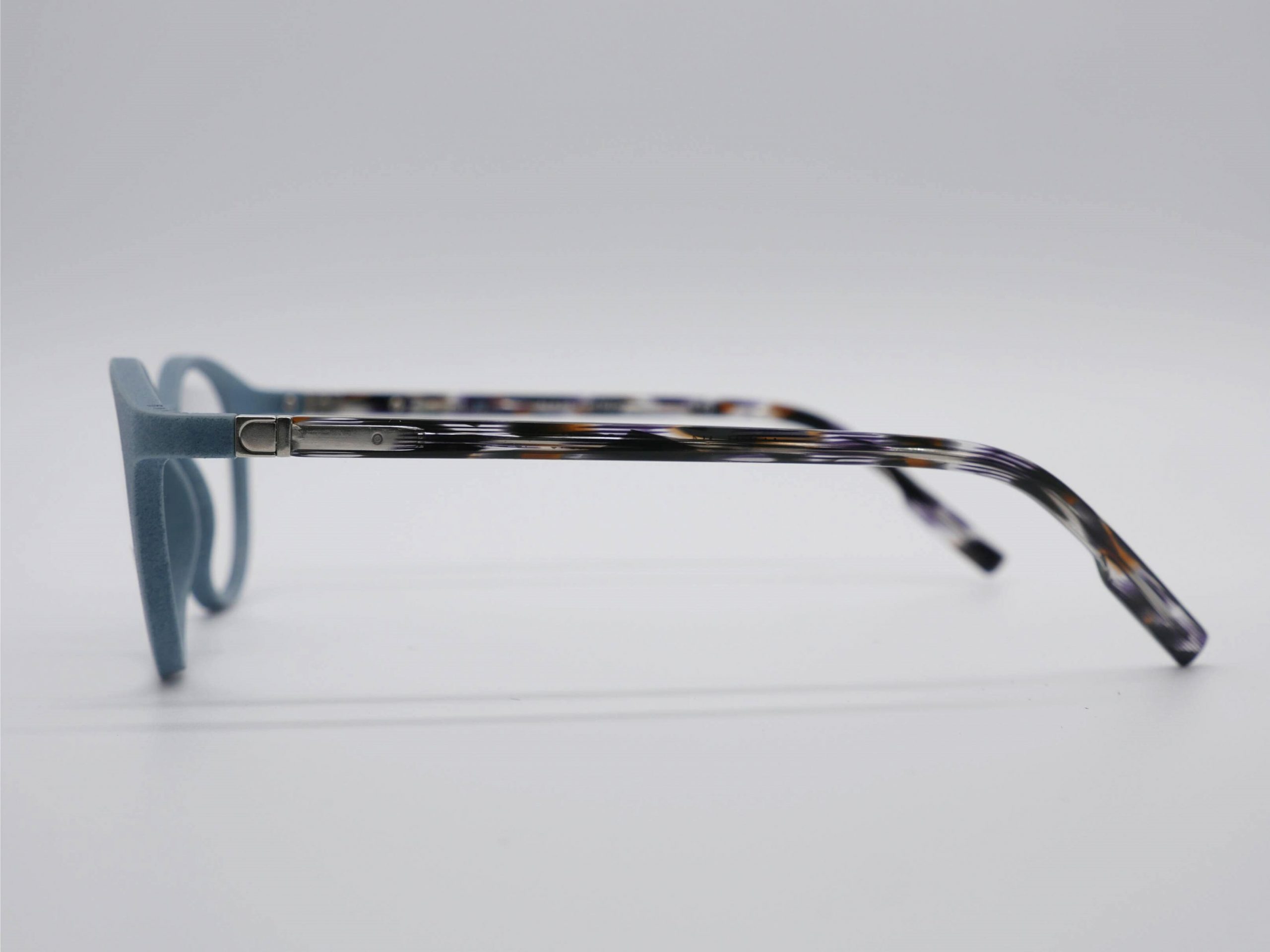 Dirigida a un hombre contemporáneo, destaca por su frontal fabricado en polímero de impresión 3D en un sobrio azul de textura mate, que aporta profundidad y una serenidad tecnológica a la mirada. El contraste se logra con varillas de acetato en un dinámico patrón carey grisáceo, creando un equilibrio visual sofisticado.
