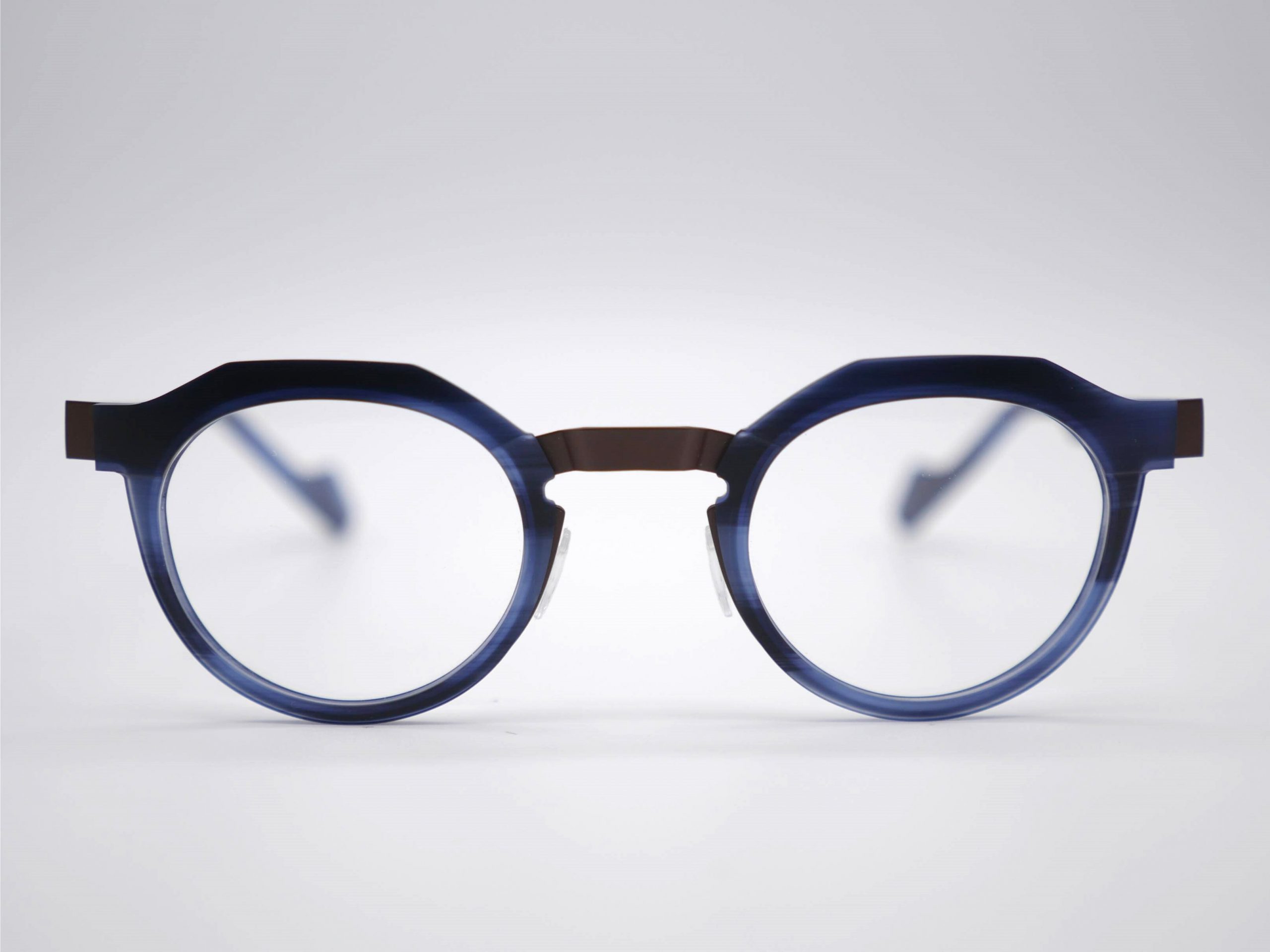 Orson, diseñado para el hombre exigente, presenta un frente de acetato con forma pantos y una audaz corona superior geométrica. El acabado azul en carey, rico en transparencias, se combina con metal en marrón mate, aportando un carácter intelectualmente sofisticado e inconfundible.