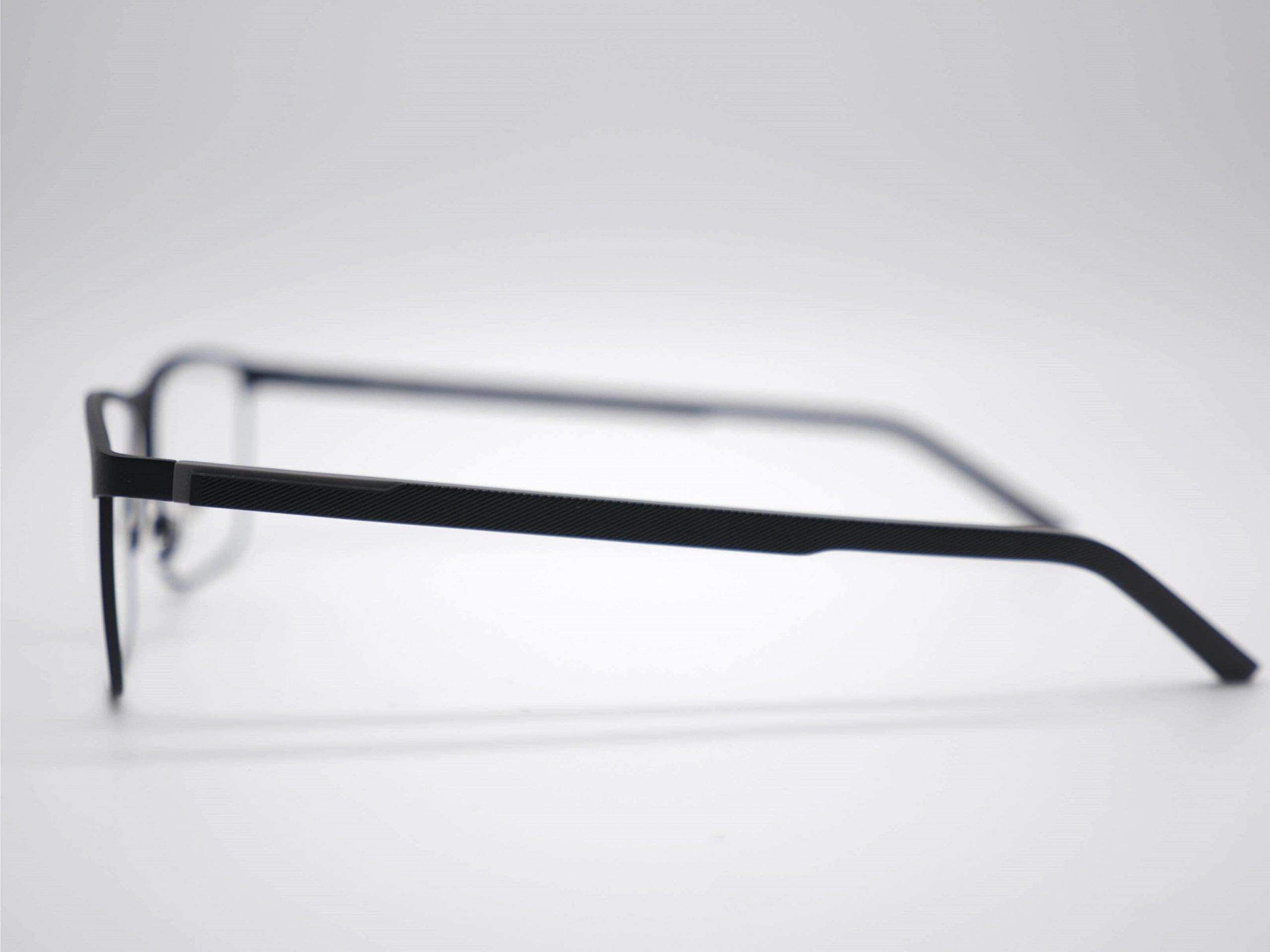 Esta montura masculina destaca por su diseño minimalista, lo que permite que la mirada sea la protagonista absoluta. El frente y el puente están fabricados en un metal de alta resistencia con un sofisticado acabado negro mate, aportando una sobriedad ejecutiva impecable. La varilla de acetato gris y negro suaviza el conjunto, ofreciendo una estética moderna y tecnológicamente avanzada.