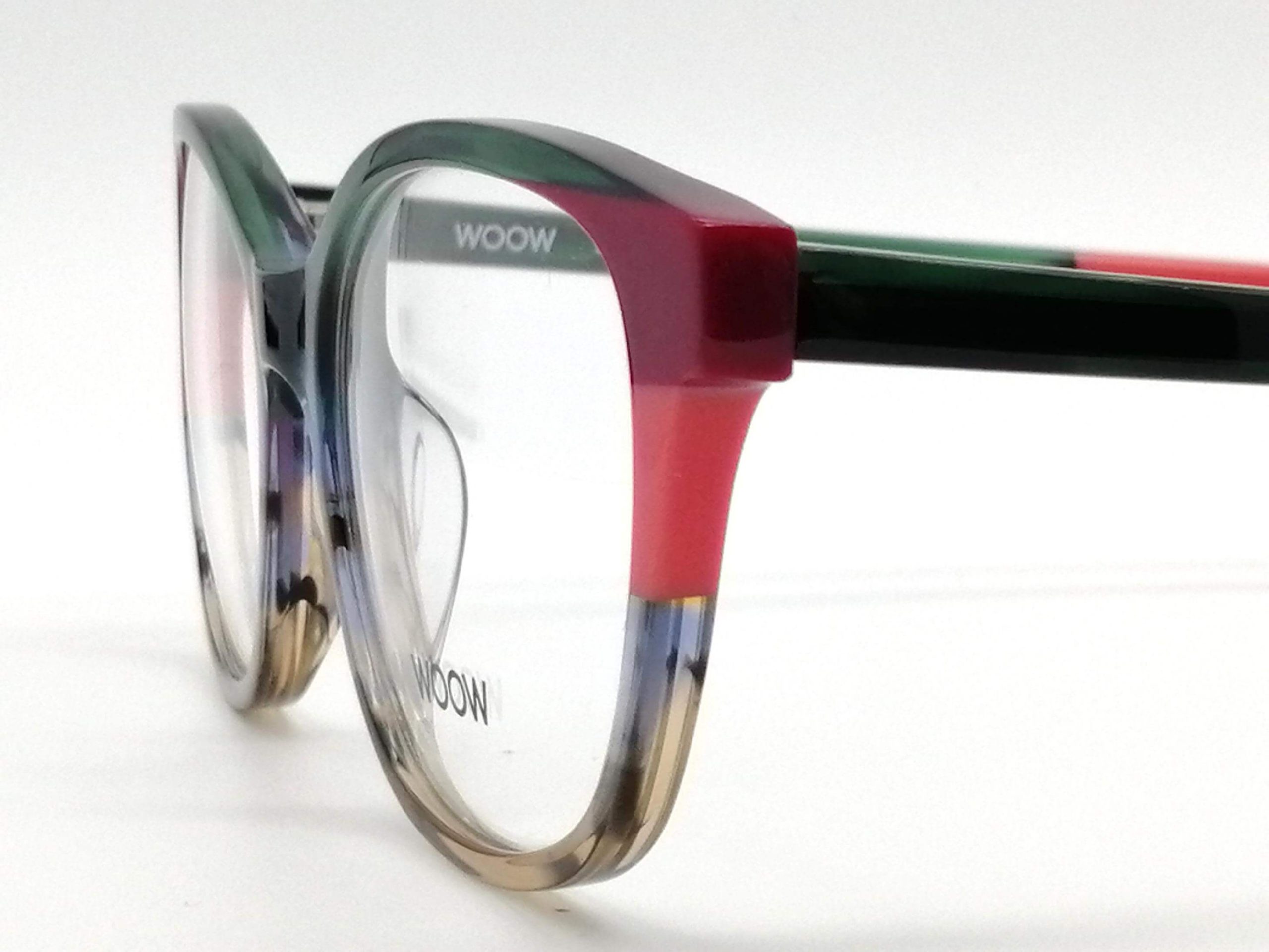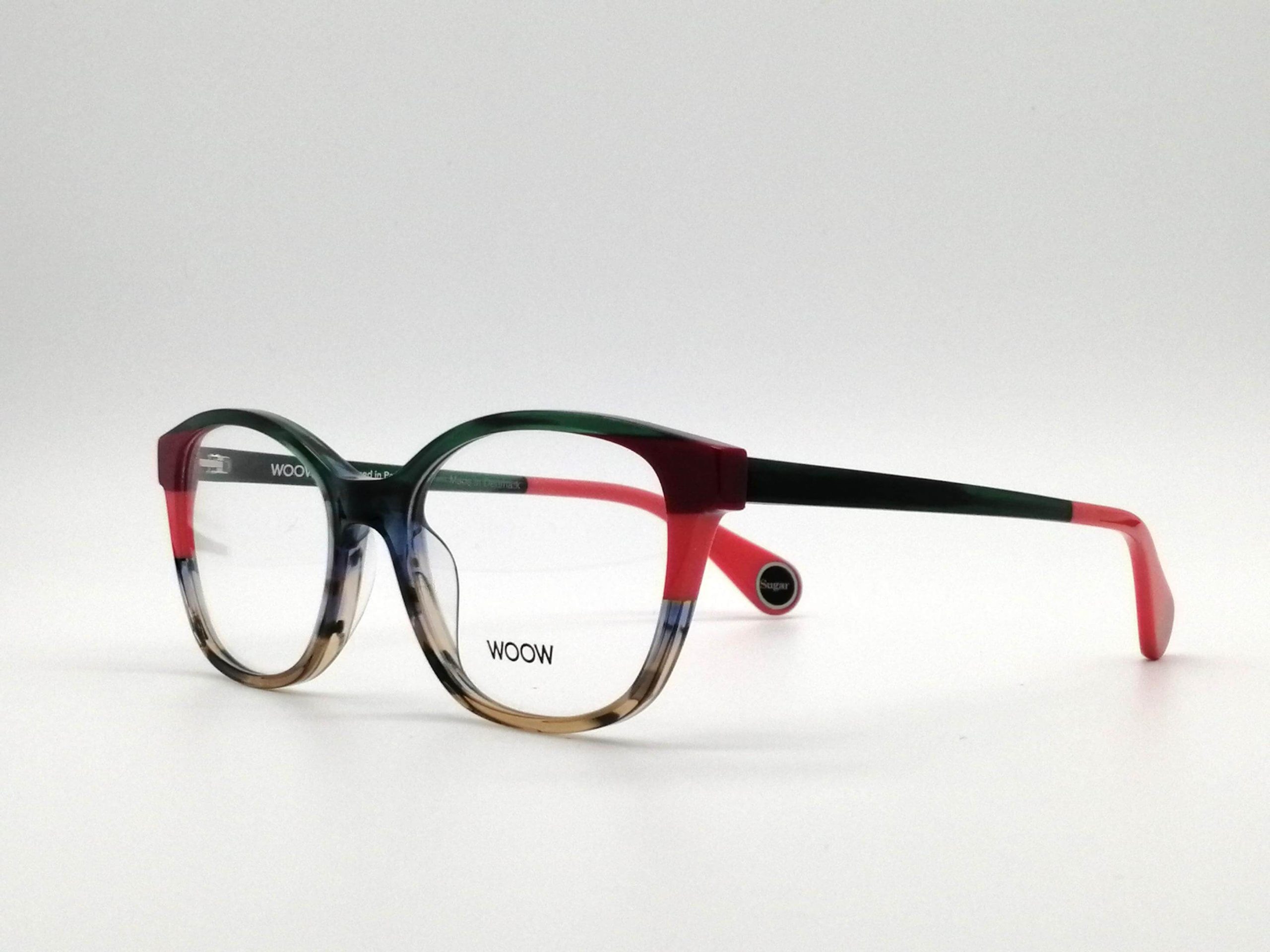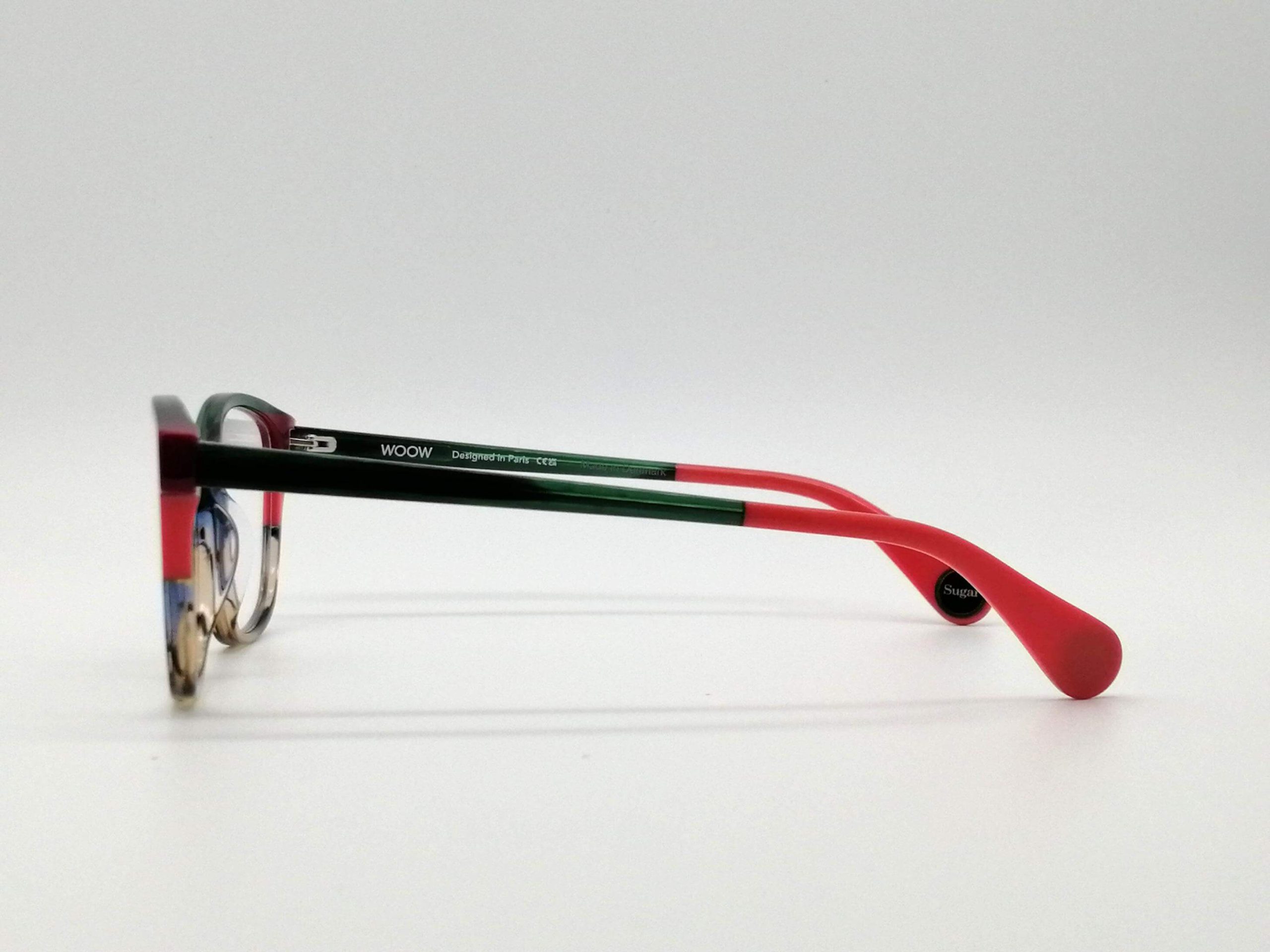El modelo Sugar Sugar 3 seduce con su silueta pantos de inspiración femenina, fabricada en un acetato de calidad superior que juega con una paleta cromática audaz. El diseño presenta un degradado magistral que transita desde un verde bosque profundo en la parte superior hacia tonos miel y azulados en la base, acentuado por terminales y detalles en rojo neón. Esta combinación de transparencias y colores eléctricos aporta una luminosidad única y un carácter lúdico a la mirada.